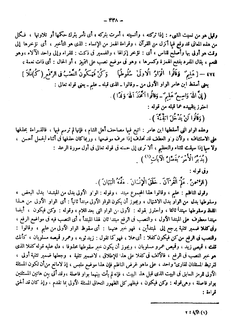 وهذه الواو التي أسقطها ابن عامر اتبع فيها مصاحف أهل الشام؛ فإنها لم ترسم فيها فالقراءة بحذفها على الاستئناف، ولأن واو العطف قد تحذف إذا عرف موضعها، وربما كان حذفها في أثناء الجمل أحسن، ولا سيما إذا سيقت للثناء والتعظيم ألا ترى إلى حسنه في قوله تعالى في أول سورة الرعد: {يُدَبِّرُ الْأَمْرَ يُفَصِّلُ الْآياتِ} 1، وفي قوله: {الرَّحْمَنُ، عَلَّمَ الْقُرْآنَ، خَلَقَ الْإِنْسَانَ، عَلَّمَهُ الْبَيَانَ} ، وقول الناظم: عليم، وقالوا هذا المجموع مبتدأ وقوله الواو الأولى بدل من المبتدأ بدل البعض وسقوطها بدل من الواو بدل الاشتمال ويجوز أن يكون الواو الأولى مبتدأ ثانيا أي الواو الأولى من هذا اللفظ وسقوطها مبتدأ ثالثا، واحترز بقوله الأولى من الواو التي بعد اللام، وقوله: وكن فيكون أيضا مبتدأ معطوف على المبتدأ الأول والنصب في الرفع مبتدأ ثانٍ لهذا المبتدأ أي النصب فيه في مواضع الرفع، وفي كفلا ضمير تثنية يرجع لى المبتدأين فهو خبر عنهما أي سقوط الواو الأولى من عليم، وقالوا: والنصب في الرفع من كن فيكون كفلا أي حملا فهو كما تقول زيد ثوبه وعمرو قميصه مسلوبان كأنك قلت قميص زيد وقميص عمرو مسلوبان ويجوز أن يكون خبر سقوطها محذوفا دل عليه قوله: كفلا الذي هو خبر النصب في الرفع فالألف في كفلا على هذا للإطلاق لا ضمير تثنية وجعلها ضمير تثنية أولى لترتبط المسألتان لقارئ واحد على ما هو غرض الناظم فإن هذا موضع ملبس؛ إذ لا مانع من أن تكون المسألة الأولى للرمز السابق في البيت الذي قبل هذا البيت فإنه لم يأت بينهما بواو فاصلة، وقد أتى بين هاتين المسألتين بواو فاصلة وهي قوله: وكن فيكون فيظهر كل الظهور التحاق المسألة الأولى بما تقدم وإذ كان قد ألحق قراءة: