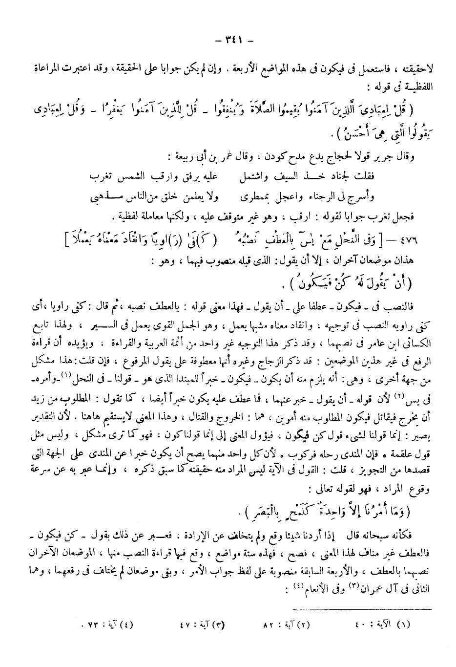 لا حقيقته، فاستعمل "في" فيكون في هذه المواضع الأربعة، وإن لم يكن جوابا على الحقيقة، وقد اعتبرت المراعاة اللفظية في قوله: {قُلْ لِعِبَادِيَ الَّذِينَ آمَنُوا يُقِيمُوا الصَّلاةَ وَيُنْفِقُوا} ، {قُلْ لِلَّذِينَ آمَنُوا يَغْفِرُوا} ، {وَقُلْ لِعِبَادِي يَقُولُوا الَّتِي هِيَ أَحْسَنُ} .