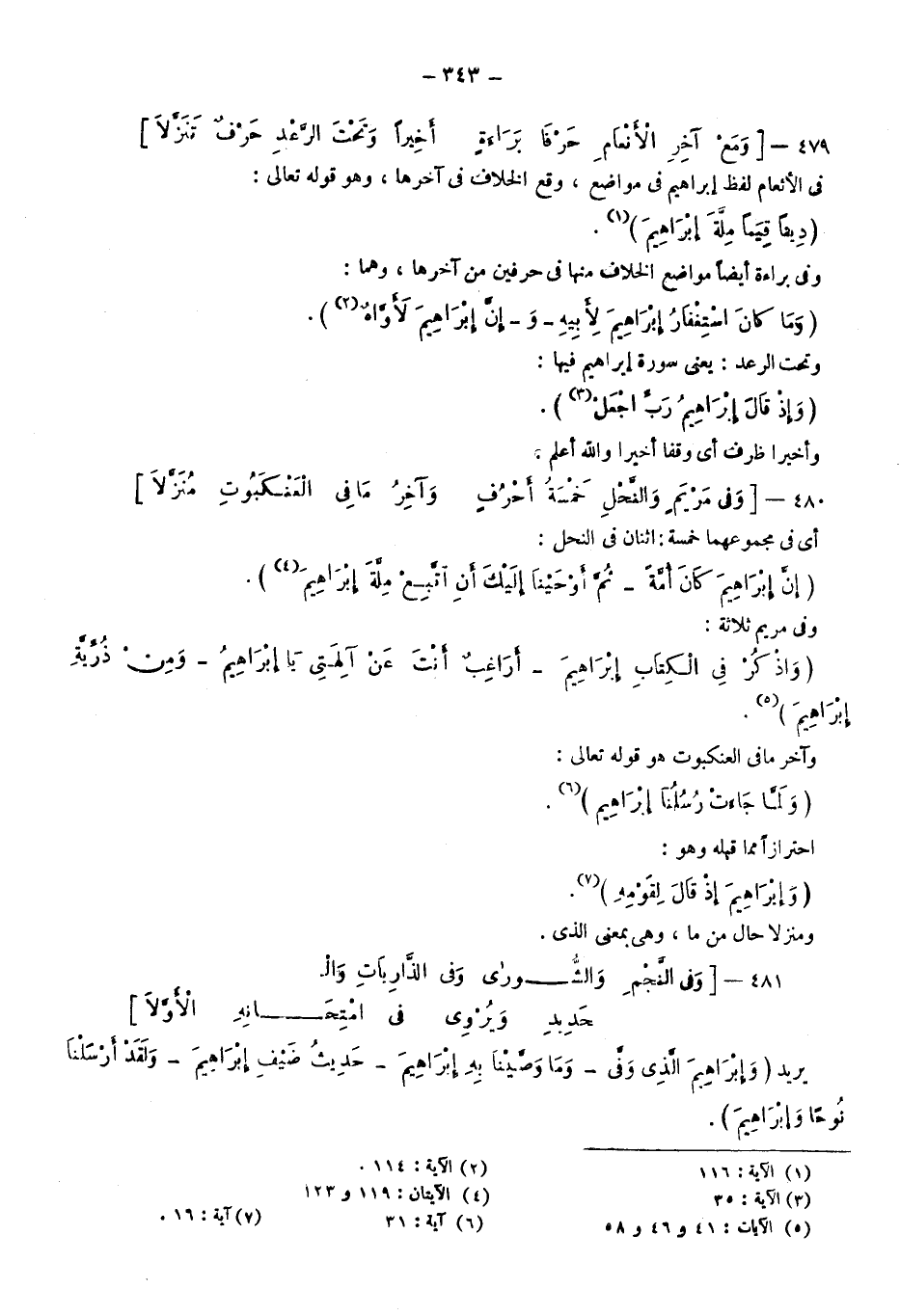 أي في مجموعهما خمسة؛ اثنان في النحل: {إِنَّ إِبْرَاهِيمَ كَانَ أُمَّةً} ، {ثُمَّ أَوْحَيْنَا إِلَيْكَ أَنِ اتَّبِعْ مِلَّةَ إِبْرَاهِيمَ} 4، وفي مريم ثلاثة: {وَاذْكُرْ فِي الْكِتَابِ إِبْرَاهِيمَ} ، {أَرَاغِبٌ أَنْتَ عَنْ آلِهَتِي يَا إِبْرَاهِيمُ} ، {وَمِنْ ذُرِّيَّةِ إِبْرَاهِيمَ} 5. وآخر ما في العنكبوت هو قوله تعالى: {وَلَمَّا جَاءَتْ رُسُلُنَا إِبْرَاهِيمَ} 6؛ احترازا مما قبله وهو: {وَإِبْرَاهِيمَ إِذْ قَالَ لِقَوْمِهِ} 7.