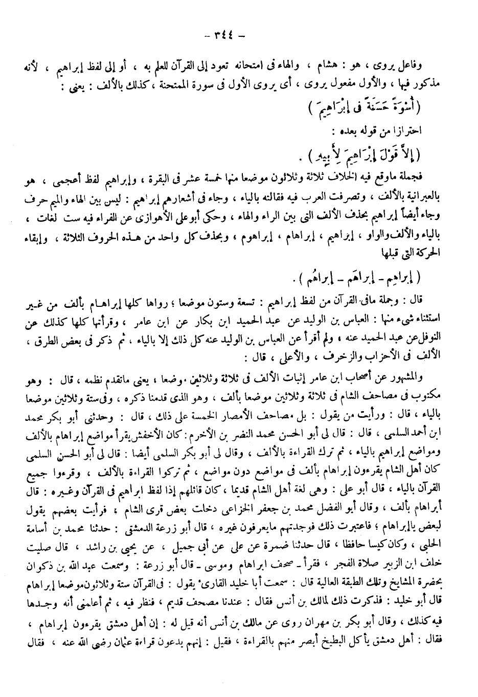 قال: وجملة ما في القرآن من لفظ إبراهيم تسعة وستون موضعا رواها كلها إبراهام بألف من غير استثناء شيء منها العباس بن الوليد عن عبد الحميد ابن بكار عن ابن عامر، وقرأتها كلها كذلك عن النوفل عن عبد الحميد عنه، ولم أقرأ عن العباس بن الوليد عنه كل ذلك إلا بالياء ثم ذكر في بعض الطرق الألف في الأحزاب والزخرف والأعلى قال: والمشهور عن أصحاب ابن عامر إثبات الألف في ثلاثة وثلاثين موضعا يعني ما تقدم نظمه، قال: وهو مكتوب في مصاحف الشام في ثلاثة وثلاثين موضعا بألف، وهو الذي قدمنا ذكره، وفي ستة وثلاثين موضعا بالياء، قال: ورأيت من يقول: بل مصاحف الأمصار الخمسة على ذلك، قال: وحدثني أبو بكر محمد ابن أحمد السلمي قال: قال لي أبو الحسن محمد النضر بن الأخرم: كان الأخفش يقرأ مواضع إبراهام بالألف، ومواضع إبراهيم بالياء، ثم ترك القراءة بالألف، وقال لي أبو بكر السلمي أيضا: قال لي أبو الحسن السلمي: كان أهل الشام يقرءون إبراهام بألف في مواضع دون مواضع، ثم تركوا القراءة بالألف وقرءوا جميع القرآن بالياء، قال أبو علي: وهي لغة أهل الشام قديما، كان قائلهم إذا لفظ إبراهيم في القرآن وغيره قال: أبراهام بألف، وقال أبو الفضل محمد بن جعفر الخزاعي: دخلت بعض قرى الشام، فرأيت بعضهم يقول لبعض: يا إبراهام فاعتبرت ذلك فوجدتهم ما يعرفون غيره، قال أبو زرعة الدمشقي: حدثنا محمد بن أسامة الحلبي -وكان كيسا حافظا- قال: حدثنا ضمرة عن علي عن أبي جميل عن يحيى بن راشد قال: صليت خلف ابن الزبير صلاة الفجر فقرأ: "صحف إبراهام وموسى"، قال أبو زرعة: وسمعت عبد الله بن ذكوان بحضرة المشايخ وتلك الطبقة العالية قال: سمعت أبا خليد القارئ يقول: في القرآن ستة وثلاثون موضعا إبراهام، قال أبو خليد: فذكرت ذلك لمالك بن أنس فقال: عندنا مصحف قديم فنظر فيه ثم أعلمني أنه وجدها فيه كذلك، وقال أبو بكر بن مهران: روي عن مالك بن أنس أنه قيل له: إن أهل دمشق يقرءون إبراهام، فقال: أهل دمشق يأكل البطيخ أبصر منهم بالقراءة، فقيل: إنهم يدعون قراءة عثمان -رضي الله عنه- فقال