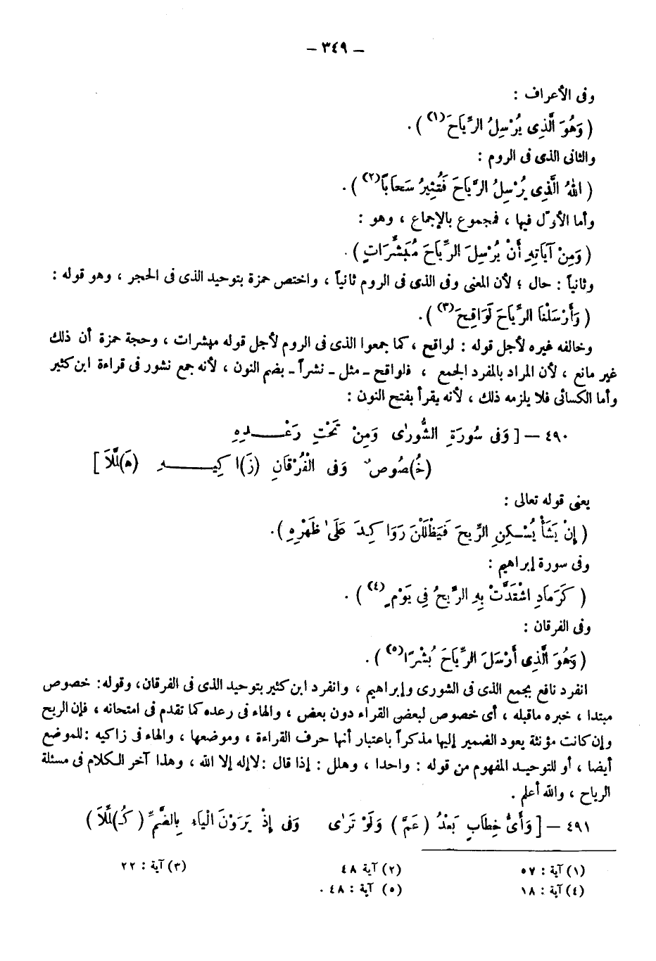 وثانيا: حال؛ لأن المعنى وفي الذي في الروم ثانيا، واختص حمزة بتوحيد الذي في الحجر وهو قوله: {وَأَرْسَلْنَا الرِّيَاحَ لَوَاقِحَ} 3، وخالفه غيره؛ لأجل قوله: لواقح كما جمعوا الذي في الروم؛ لأجل قوله: "مبشرات"، وحجة حمزة أن ذلك غير مانع؛ لأن المراد بالمفرد الجمع فلواقح مثل "نشرا" بضم النون؛ لأنه جمع نشور في قراءة ابن كثير، وأما الكسائي فلا يلزمه ذلك؛ لأنه يقرأ بفتح النون.