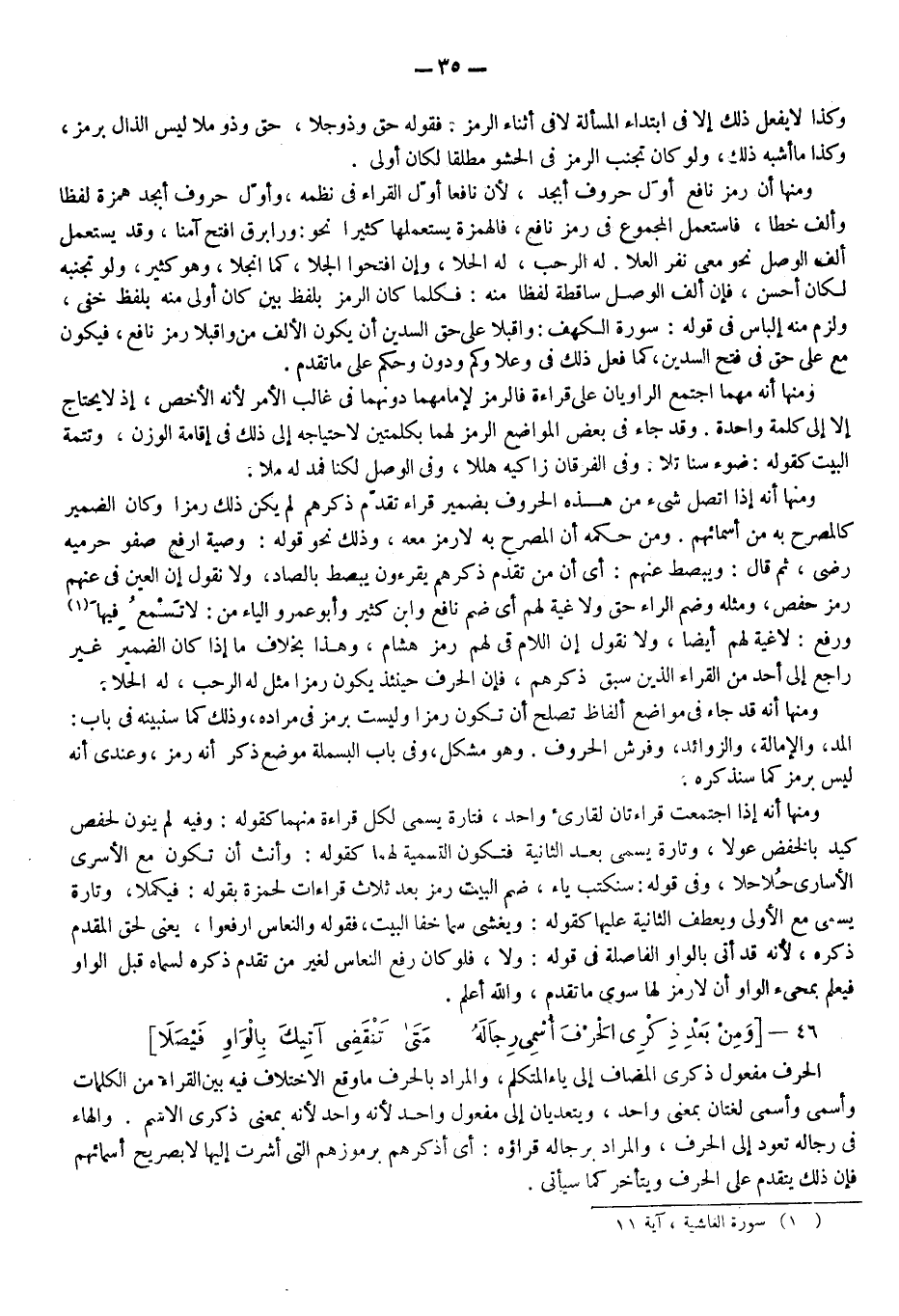 ومنها أنه إذا اجتمعت قراءتان لقارئ واحد فتارة يسمى لكل قراءة منهما كقوله: وفيه لم ينون لحفص كيد بالخفض عولا وتارة يسمى بعد الثانية فتكون التسمية لهما كقوله: وأنث ان تكون مع الأسرى الأسارى حلا حلا وفي قوله: سنكتب ياء ضم البيت رمز بعد ثلاث قراءات لحمزة بقوله فيكملا وتارة يسمى مع الأولى ويعطف الثانية عليها كقوله: ويغشى سما خفا البيت فقوله والنعاس ارفعوا يعني لحق المقدم ذكره؛ لأنه قد أتى بالواو الفاصلة في قوله: ولا فلو كان رفع النعاس لغير من تقدم ذكره لسماه قبل الواو فيعلم بمحئ الواو أن لا رمز لها سوى ما تقدم والله أعلم.