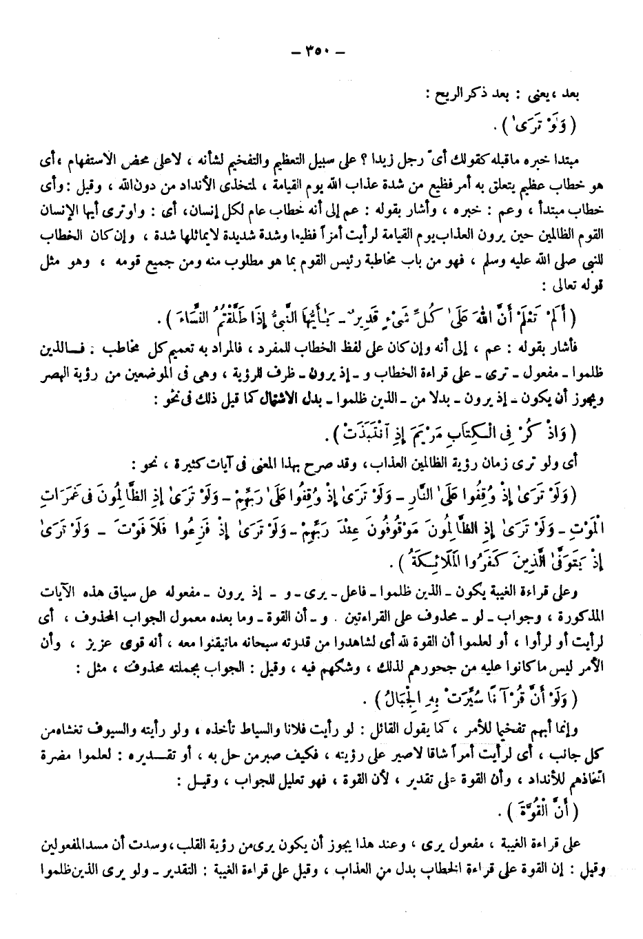 فأشار بقوله: عم إلى أنه وإن كان على لفظ الخطاب للمفرد فالمراد به تعميم كل مخاطب فالذين ظلموا "مفعول" ترى على قراءة الخطاب، و"إذ يرون" ظرف للرؤية، وهي في الموضعين من رؤية البصر، ويجوز أن يكون "إذ يرون" بدلا من "الذين ظلموا" بدل الاشتمال كما قيل ذلك في نحو: {وَاذْكُرْ فِي الْكِتَابِ مَرْيَمَ إِذِ انْتَبَذَتْ} .