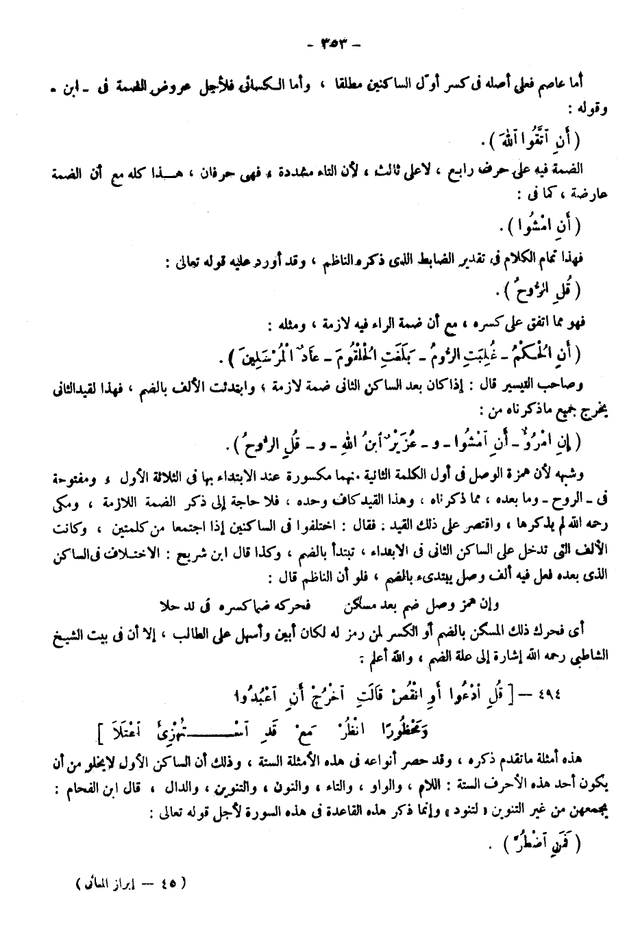 فهذا تمام الكلام في تقدير الضابط الذي ذكره الناظم، وقد أورد عليه قوله تعالى: {قُلِ الرُّوحُ} ، فهو مما اتفق على كسره مع أن ضمة الراء فيه لازمة، ومثله: {إِنِ الْحُكْمُ} ، {غُلِبَتِ الرُّومُ} ، {بَلَغَتِ الْحُلْقُومَ} ، {عَادٌ الْمُرْسَلِينَ} .
