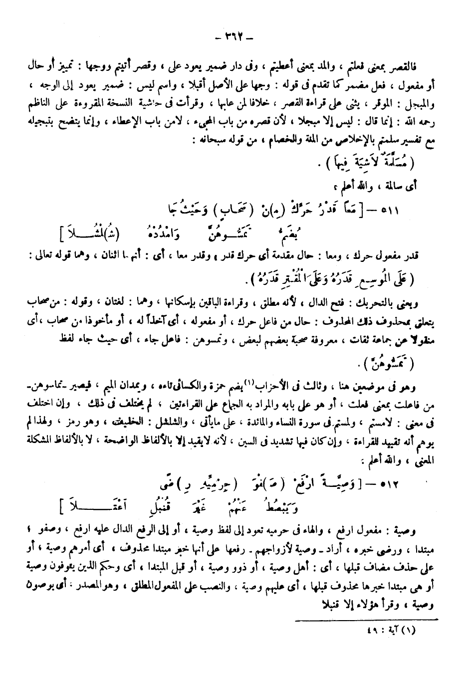وصية: مفعول ارفع، والهاء في حرميه تعود إلى لفظ وصية، أو إلى الرفع الدالّ عليه ارفع، وصفو مبتدأ، ورضى خبره أراد: "وصيةٌ لأزواجِهِم" رفعها على أنها خبر مبتدأ محذوف؛ أي: أمرهم وصية أو على حذف مضاف قبلها؛ أي: أهل وصية أو ذوو وصية أو قبل المبتدأ؛ أي: وحكم الذين يتوفون وصية أو هي مبتدأ خبرها محذوف قبلها؛ أي: عليهم وصية، والنصب على المفعول المطلق، وهو المصدر؛ أي: يوصون وصية، وقرأ هؤلاء إلا قنبلا.