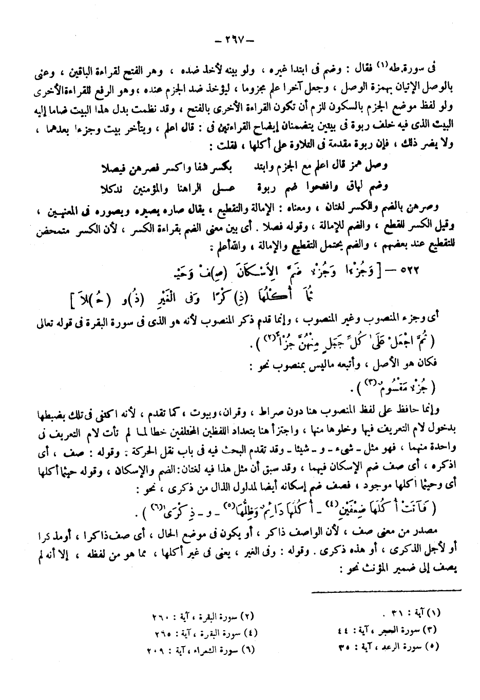 في سورة طه1 فقال: وضم في ابتدأ غيره، ولو بينه لأخذ ضده، وهو الفتح؛ لقراءة الباقين، وعنى بالوصل الإتيان بهمزة الوصل، وجعل آخرا علم مجزوما؛ ليؤخذ ضد الجزم عنده، وهو الرفع للقراءة الأخرى، ولو لفظ موضع الجزم بالسكون للزم أن تكون القراءة الأخرى بالفتح، وقد نظمت بدل هذا البيت ضاما إليه البيت الذي فيه خلف ربوة في بيتين يتضمنان إيضاح القراءتين في قال اعلم، ويتأخر بيت، وجزءًا بعدهما، ولا يضر ذلك؛ فإن ربوة مقدمة في التلاوة على أكلها فقلت: