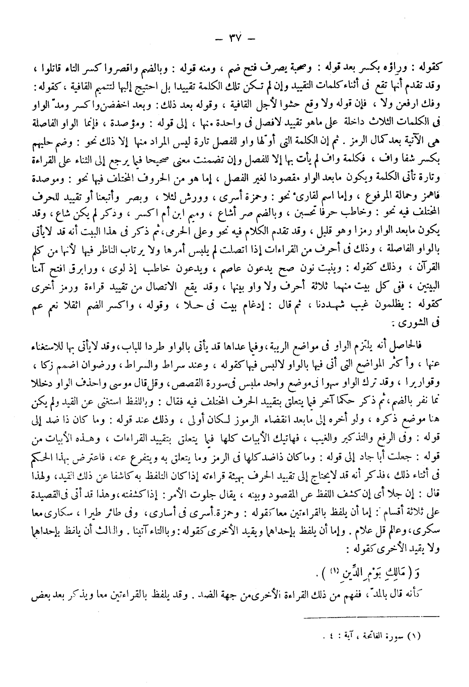 فالحاصل أنه يلتزم الواو في مواضع الريبة وفيما عداها قد يأتي بالواو طردا للباب وقد لا يأتي بها للاستغناء عنها وأكثر المواضع التي أتى فيها بالواو لا لبس فيها كقوله: وعند سراط والسراط ورضوان اضمم زكا وقواريرا، وقد ترك الواو سهوا في موضع واحد ملبس في سورة القصص وقل قال موسى واحذف الواو دخللا نما نفر بالضم ثم ذكر حكما آخر فيما يتعلق بتقييد الحرف المختلف فيه فقال: وباللفظ استغنى عن القيد ولم يكن هنا موضع ذكره ولو أخره إلى ما بعد انقضاء الرموز لكان أولى وذلك عند قوله: وما كان ذا ضد ... إلى قوله: وفي الرفع والتذكير والغيب فهاتيك الأبيات كلها فيما يتعلق بتقييد القراءات، وهذه الأبيات من قوله: جعلت أبا جاد ... إلى قوله: وما كان ذا ضد كلها في الرمز وما يتعلق به ويتفرع عنه فاعترض بهذا الحكم في أثناء ذلك فذكر أنه قد لا يحتاج إلى تقييد الحرف بهيئة قراءته إذا كان التلفظ به كاشفا عن ذلك القيد، ولهذا قال: إن جلا أي إن كشف اللفظ عن المقصود وبينه يقال جلوت الأمر إذا كشفته، وهذا قد أتى في القصيدة على ثلاثة أقسام إما أن يلفظ بالقراءتين معا كقوله: وحمزة أسرى في أسارى وفي طائر طيرا سكارى معا سكرى وعالم قل علام، وإما أن يلفظ بإحداهما ويقيد الأخرى كقوله: وبالتاء آتينا، والثالث أن يلفظ بإحداهما ولا يقيد الأخرى كقوله: و {مَالِكِ يَوْمِ الدِّينِ} 1.