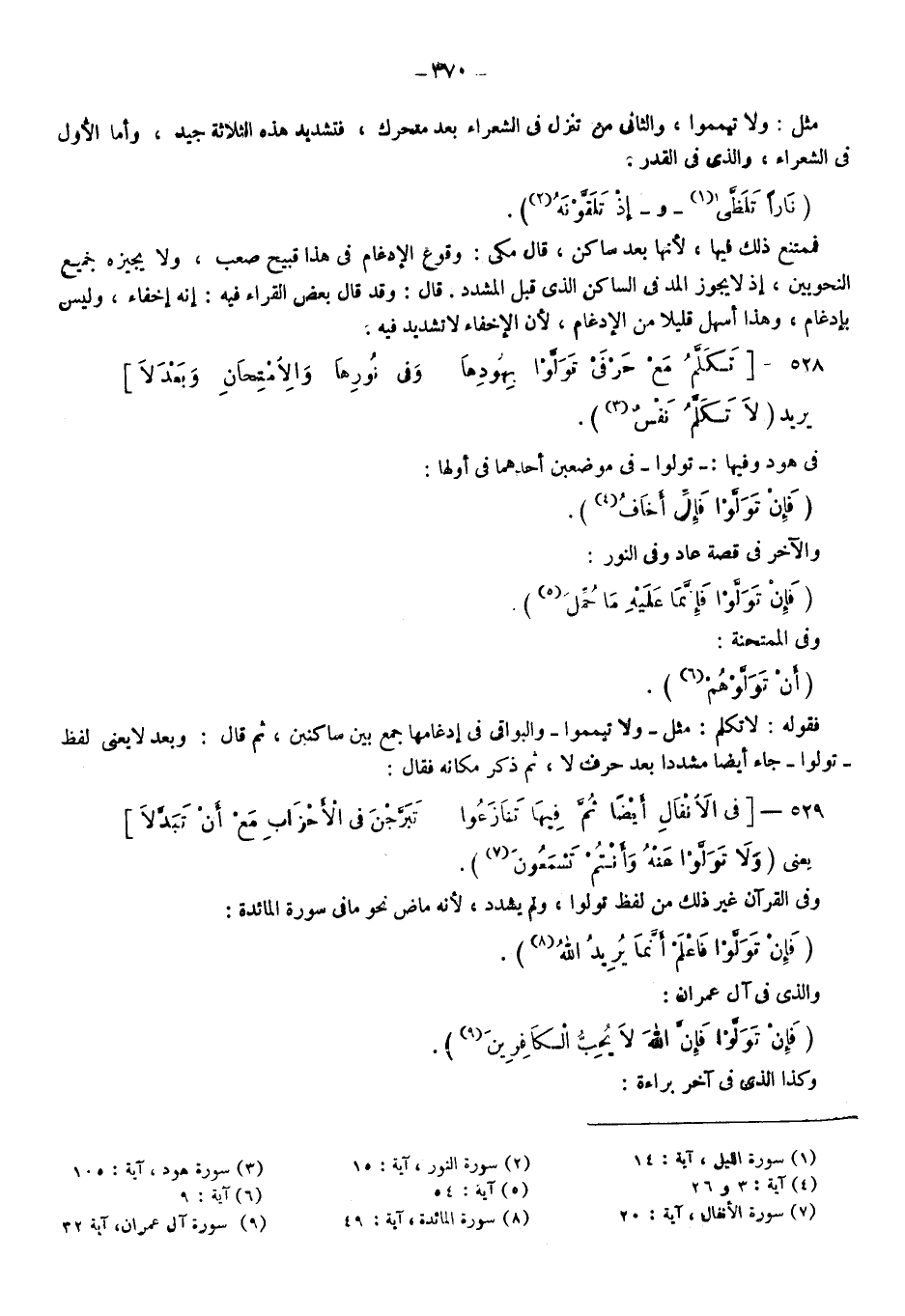 يعني: {وَلا تَوَلَّوْا عَنْهُ وَانْتُمْ تَسْمَعُونَ} 7، وفي القرآن غير ذلك من لفظ تولوا، ولم يشدد؛ لأنه ماضٍ نحو ما في سورة المائدة: {فَإِنْ تَوَلَّوْا فَاعْلَمْ انَّمَا يُرِيدُ اللَّهُ} 8.