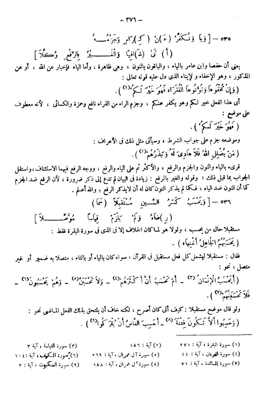 فقال: مستقبلا؛ ليشمل كل فعل مستقبل في القرآن سواء كان بالياء وأو بالتاء متصلا به ضمير أو غير متصل نحو: {أَيَحْسَبُ الْإِنْسَانُ} 3، {أَمْ تَحْسَبُ أَنَّ أَكْثَرَهُمْ} 4، {وَلا تَحْسَبَنّ} 5، {وَهُمْ يَحْسَبُونَ} 6، {فَلا تَحْسَبَنَّهُمْ} 7.
