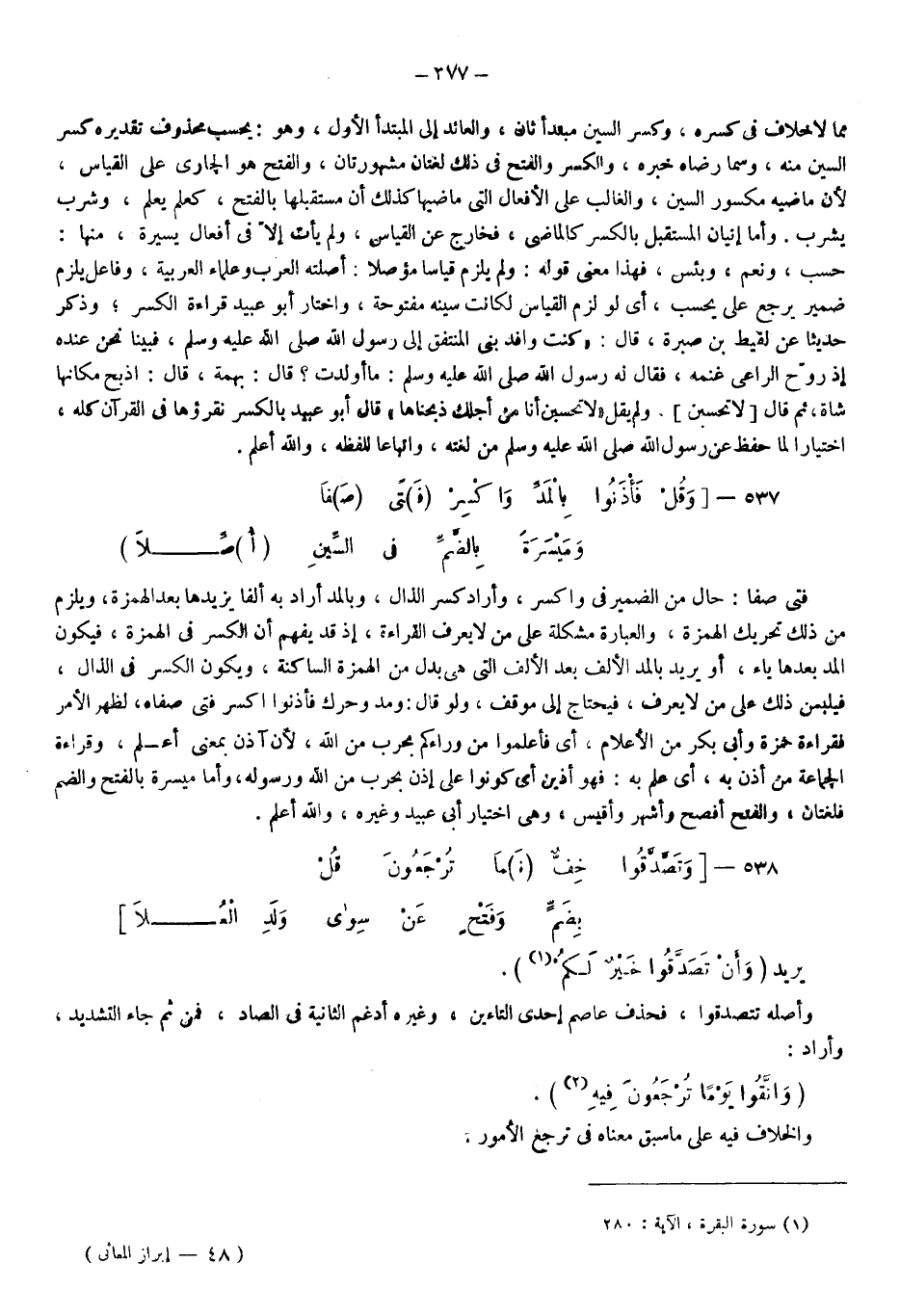 مما لا خلاف في كسره، وكسر السين مبتدأ ثانٍ، والعائد إلى المبتدأ الأول، وهو يحسب محذوف تقديره كسر السين منه، وسما رضاه خبره، والكسر، والفتح في ذلك لغتان مشهورتان، والفتح هو الجاري على القياس؛ لأن ماضيه مكسور السين، والغالب على الأفعال التي ماضيها كذلك أن مستقبلها بالفتح كـ "علِم يعلَم"، و"شرب يشرب"، وأما إتيان المستقبل بالكسر كالماضي فخارج عن القياس، ولم يأت إلا في أفعال يسيرة منها حسب ونعم وبئس، فهذا معنى قوله: ولم يلزم قياسًا مؤصلًا أصلته العرب وعلماء العربية، وفاعل يلزم ضمير يرجع على يحسب؛ أي: لو لزم القياس لكانت سينه مفتوحة، واختار أبو عبيد قراءة الكسر، وذكر حديثا عن لقيط بن صبرة قال: كنت وافد بني المنتفق إلى رسول الله -صلى الله عليه وسلم- فبينا نحن عنده إذ روح الراعي غنمه، فقال له رسول الله -صلى الله عليه وسلم: "ما أولدت" قال: بهمة قال: "اذبح مكانها شاة"، ثم قال: "لا تحسبن" -ولم يقل لا تحسبن أنا من أجلك ذبحناها- قال أبو عبيد: بالكسر نقرؤها في القرآن كله اختيارا لما حفظ عن رسول الله -صلى الله عليه وسلم- من لغته واتباعا للفظه والله أعلم.