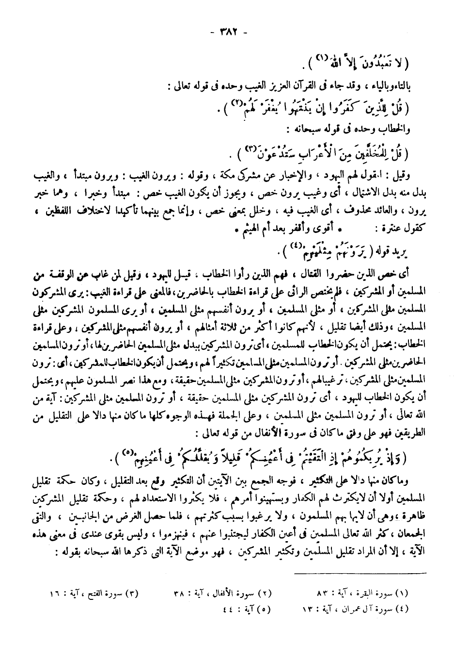 يريد قوله: {يَرَوْنَهُمْ مِثْلَيْهِمْ} 4؛ أي: خص الذين حضروا القتال فهم الذين رأوا الخطاب قيل لليهود وقيل لمن غاب عن الوقفة من المسلمين أو المشركين فلم يختص الرائي على قراءة الخطاب بالحاضرين، فالمعنى على قراءة الغيب: يرى المشركون المسلمين مثلي المشركين أو مثلي المسلمين أو يرون أنفسهم مثلي المسلمين أو يرى المسلمون المشركين مثلي المسلمين، وذلك أيضا تقليل؛ لأنهم كانوا أكثر من ثلاثة أمثالهم أو يرون أنفسهم مثلي المشركين، وعلى قراءة الخطاب يحتمل أن يكون الخطاب للمسلمين؛ أي: ترون المشركين ببدل مثلي المسلمين الحاضرين لها أو ترون المسلمين الحاضرين مثلي المشركين أو ترون المسلمين مثلي المسلمين تكثيرا لهم، ويحتمل أن يكون الخطاب للمشركين؛ أي: ترون المسلمين مثلي المشركين ترغيبا لهم أو ترون المشركين مثلي المسلمين حقيقة، ومع هذا نصر المسلمون عليهم، ويحتمل أن يكون الخطاب لليهود؛ أي: ترون المشركين مثلي المسلمين حقيقة أو ترون المسلمين مثلي المشركين آية من الله تعالى أو ترون المسلمين مثلي المسلمين، وعلى الجملة فهذه الوجوه كلها ما كان منها دالا على التقليل من الطريقين فهو على وفق ما كان في سورة الأنفال من قوله تعالى: {وَإِذْ يُرِيكُمُوهُمْ إِذِ الْتَقَيْتُمْ فِي أَعْيُنِكُمْ قَلِيلًا وَيُقَلِّلُكُمْ فِي أَعْيُنِهِمْ} 5.