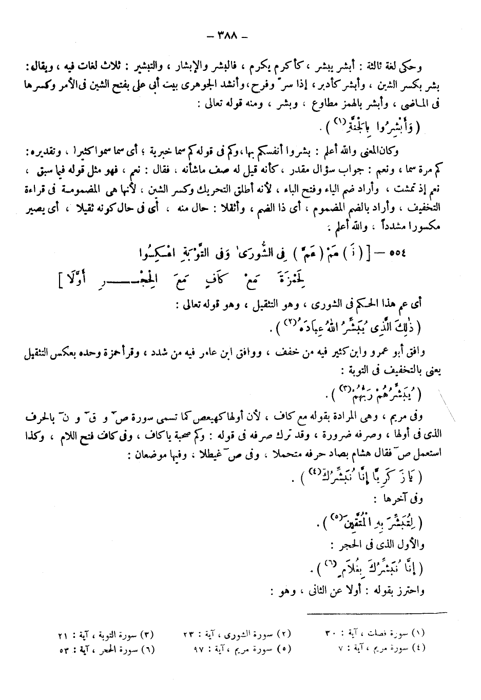 أي عم هذا الحكم في الشورى وهو التثقيل، وهو قوله تعالى: {ذَلِكَ الَّذِي يُبَشِّرُ اللَّهُ عِبَادَهُ} 2، وافق أبو عمرو وابن كثير فيه من خفف، ووافق ابن عامر فيه من شدد، وقرأ حمزة وحده بعكس التثقيل يعني بالتخفيف في التوبة: {يُبَشِّرُهُمْ رَبُّهُمْ} 3.