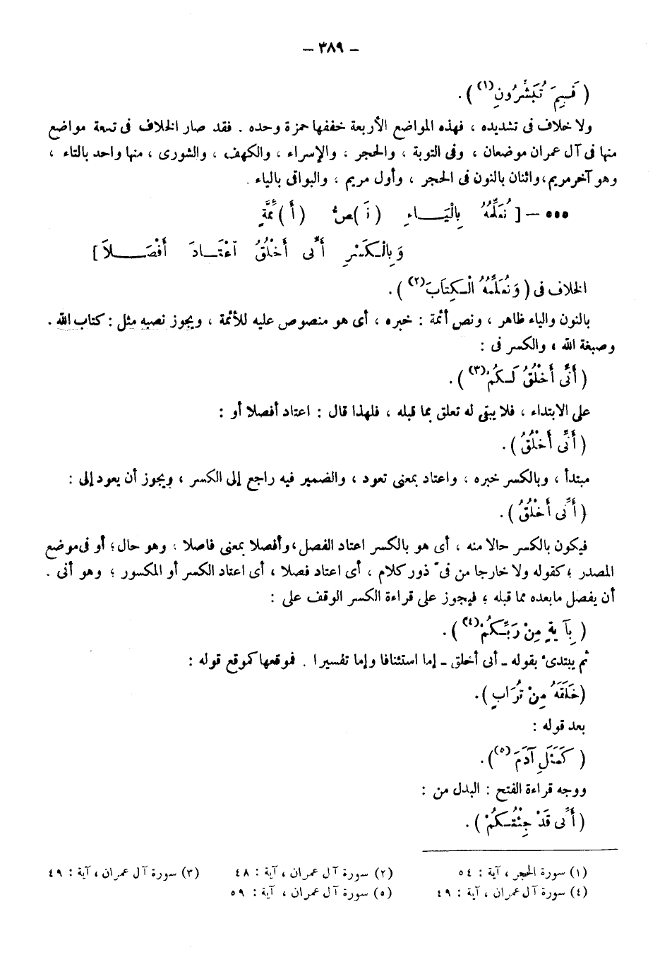 الخلاف في: "ونعلمه الكتاب"2 بالنون والياء ظاهر، ونص أئمة خبره؛ أي: هو منصوص عليه للأئمة، ويجوز نصبه مثل: كتاب الله وصبغة الله والكسر في: {أَنِّي أَخْلُقُ لَكُمْ} 3 على الابتداء فلا يبقى له تعلق بما قبله، فلهذا قال: اعتاد أفصلا أو: {أَنِّي أَخْلُقُ} مبتدأ وبالكسر خبره، واعتاد بمعنى تعود، والضمير فيه راجع إلى الكسر، ويجوز أن يعود إلى: {أَنِّي أَخْلُقُ} ، فيكون بالكسر حالا منه؛ أي: هو بالكسر اعتاد الفصل وأفصلا بمعنى فاصلا وهو حال أو في موضع المصدر كقوله: ولا خارجا من في ذور كلام؛ أي: اعتاد فصلا؛ أي: اعتاد الكسر أو المكسور وهو أني أن يفصل ما بعده مما قبله فيجوز على قراءة الكسر الوقف على: {بِآيَةٍ مِنْ رَبِّكُمْ} 4.
