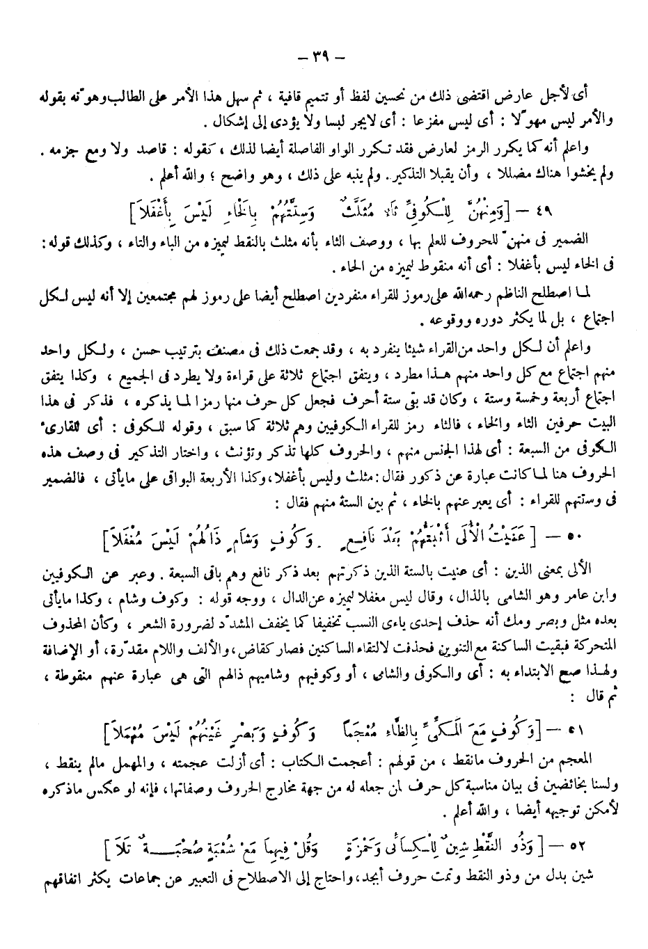 الألى بمعنى الذين: أي عنيت بالستة الذين ذكرتهم بعد ذكر نافع وهم باقي السبعة. وعبر عن الكوفيين وابن عامر وهو الشامي بالذال وقال ليس مغفلا ليميزه عن الدال ووجه قوله وكوف وشام وكذا ما يأتي بعده مثل وبصر ومك أنه حذف إحدى ياءي النسب تخفيفا كما يخفف المشدد لضرورة الشعر وكأن المحذوف المتحركة فبقيت الساكنة مع التنوين فحذفت لالتقاء الساكنين فصار كقاض والألف واللام مقدرة أو الإضافة ولهذا صح الابتداء به أي والكوفي والشامي أو وكوفيهم وشاميهم ذالهم التي هي عبارة عنهم منقوطة ثم قال: