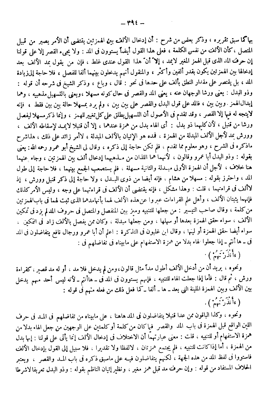 ونحوه: يريد أن من أدخل الألف أطول مدا مثل قالون، ومن لم يدخل فلا مد أو له مد قصير كقراءة ورش ثم قال: فأما إذا جعلت الهاء للتنبيه فإنهم يستوون في المد في "ها أنتم"؛ لأنه ليس أحد منهم يدخل بين الألف، وبين الهمزة الملينة التي بعد "ها" ألفا كما فعل ذلك من فعله منهم في قوله: "أأندرتهم"، ونحوه: وكذا الباقون ممن عدا قنبلا يتفاضلون في المد هاهنا على ما بيناه من تفاضلهم في المد في حرف اللين الواقع قبل الهمزة في باب المد والقصر فيما كان من كلمة أو كلمتين على الوجهين من جعل الهاء بدلا من همزة الاستفهام أو للتنبيه قلت معنى عبارتهما أن الاختلاف في إدخال الألف إنما يأتي على قولنا: إنها بدل من الهمزة أما إذا كانت للتنبيه فلم يجتمع همزتان لا لفظا ولا تقديرا، فلا سبيل إلى القول بإدخال الألف، فاستووا في لفظ المد من هذه الجهة لكنهم يتفاضلون فيه على ما سبق ذكره في باب المد والقصر، ويعتبر الخلاف المستفاد من قوله: وإن حرف مد قبل همز مغير ونظير إتيان الناظم بقوله: وذو البدل تعريفا لا شرطا