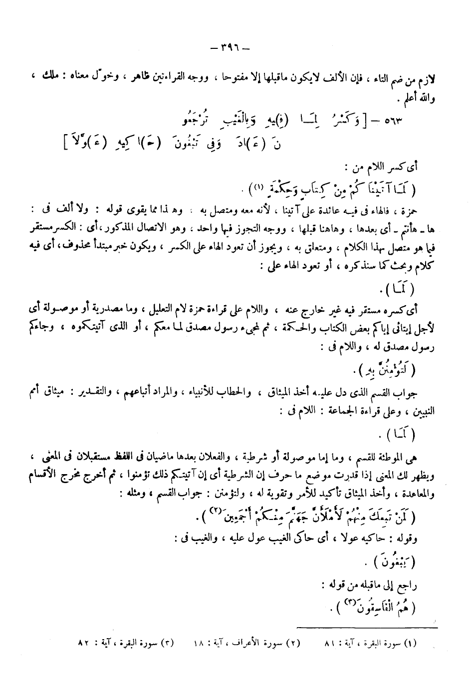أي كَسَر اللام من: "لما آتيناكم من كتاب وحكمة" حمزة، فالهاء في فيه عائدة على آتينا؛ لأنه معه ومتصل به، وهذا مما يقوي قوله: ولا ألف في ها "هأنتم"؛ أي: بعدها وههنا قبلها، ووجه التجوز فيها واحد وهو الاتصال المذكور؛ أي: الكسر مستقر فيما هو متصل بهذا الكلام ومتعلق به، ويجوز أن تعود الهاء على الكسر، ويكون خبر مبتدأ محذوف؛ أي: فيه كلام وبحث كما سنذكره أو تعود الهاء على: "لَمَا".