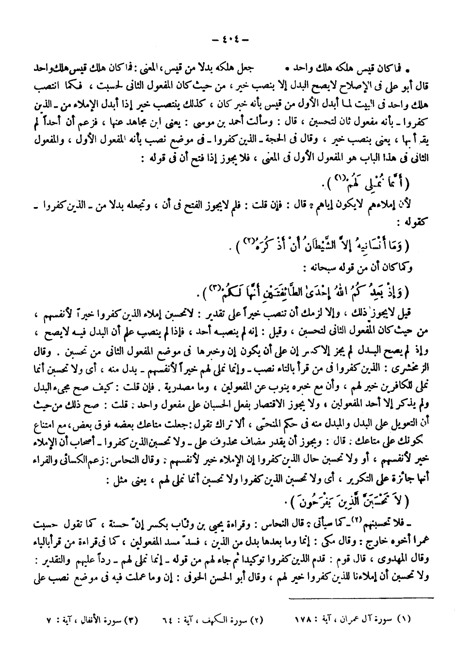 جعل هلكه بدلا من قيس المعنى: فما كان هلك قيس هلك واحد، قال أبو علي في الإصلاح: لا يصح البدل إلا بنصب خير من حيث كان المفعول الثاني لحسبت فكما انتصب هلك واحد في البيت لما أبدل الأول من قيس بأنه خبر كان كذلك ينتصب خير إذا أبدل الإملاء من {الَّذِينَ كَفَرُوا} بأنه مفعول ثانٍ لتحسبن، قال: وسألت أحمد بن موسى -يعني ابن مجاهد- عنها، فزعم أن أحدا لم يقرأ بها يعني: بنصب خير، وقال في الحجة: {الَّذِينَ كَفَرُوا} في موضع نصب بأنه المفعول الأول والمفعول الثاني في هذا الباب هو المفعول الأول في المعنى فلا يجوز إذا فتح أن في قوله: {أَنَّمَا نُمْلِي لَهُمْ} 1؛ لأن إملاءهم لا يكون إياهم، قال: فإن قلت: فلم لا يجوز الفتح في أن وتجعله بدلا من {الَّذِينَ كَفَرُوا} كقوله: {وَمَا أَنْسَانِيهُ إِلَّا الشَّيْطَانُ أَنْ أَذْكُرَهُ} 2، وكما كان أن من قوله سبحانه: {وَإِذْ يَعِدُكُمُ اللَّهُ إِحْدَى الطَّائِفَتَيْنِ أَنَّهَا لَكُمْ} 2.
