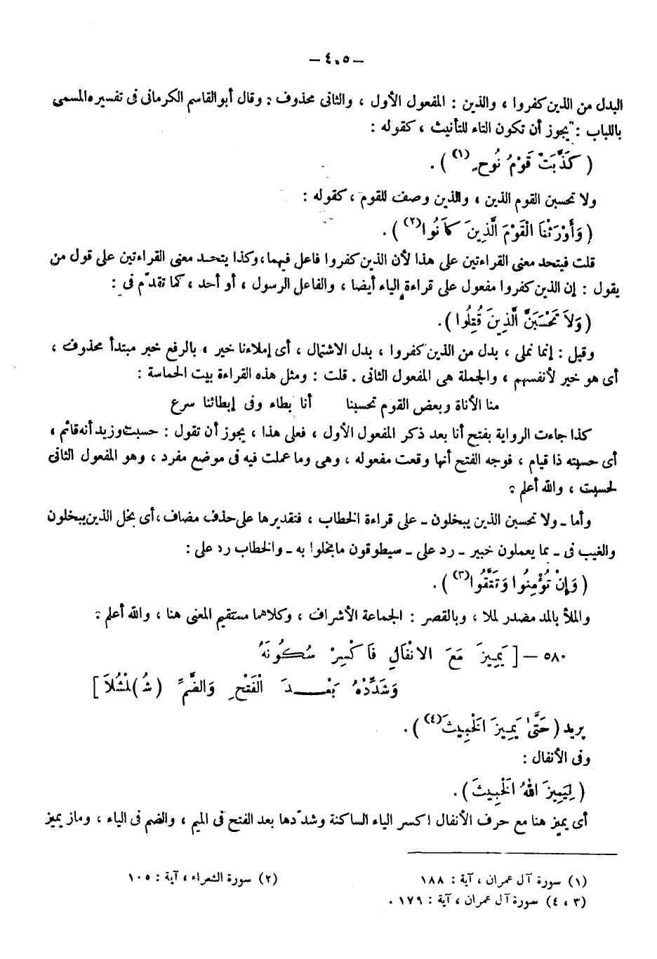 قلت: فيتَّحد معنى القراءتين على هذا؛ لأن الذين كفروا فاعل فيهما، وكذا يتحد معنى القراءتين على قول من يقول إن الذين كفروا مفعول على قراءة الياء أيضا والفاعل الرسول أو أحد كما تقدم في: {وَلا تَحْسَبَنَّ الَّذِينَ قُتِلُوا} .