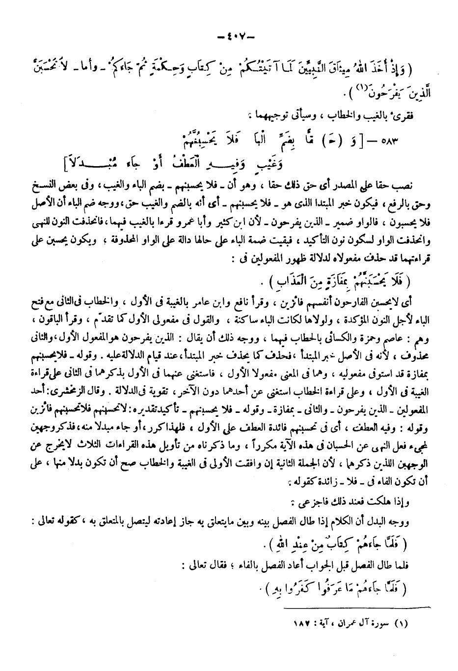 {وَإِذْ أَخَذَ اللَّهُ مِيثَاقَ النَّبِيِّينَ لَمَا آتَيْتُكُمْ مِنْ كِتَابٍ وَحِكْمَةٍ ثُمَّ جَاءَكُمْ} وأما {لا تَحْسَبَنَّ الَّذِينَ يَفْرَحُونَ} 1، فقرئ بالغيب والخطاب، وسيأتي توجيههما.