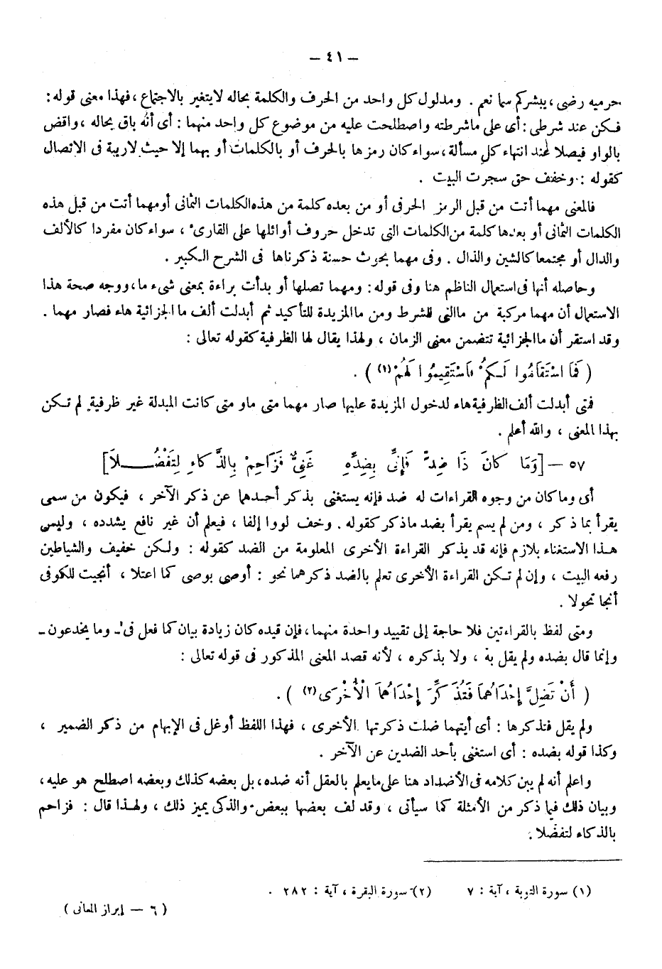حرميه رضى يبشركم سما نعم، ومدلول كل واحد من الحرف والكلمة بحاله لا يتغير بالاجتماع فهذا معنى قوله: فكن عند شرطي: أي على ما شرطته واصطلحت عليه من موضوع كل واحد منهما: أي أنه باق بحاله واقض بالواو فيصلا عند انتهاء كل مسألة سواء كان رمزها بالحرف أو بالكلمات أو بهما إلا حيث لا ريبة في الاتصال كقوله: وخفف حق سجرت البيت.