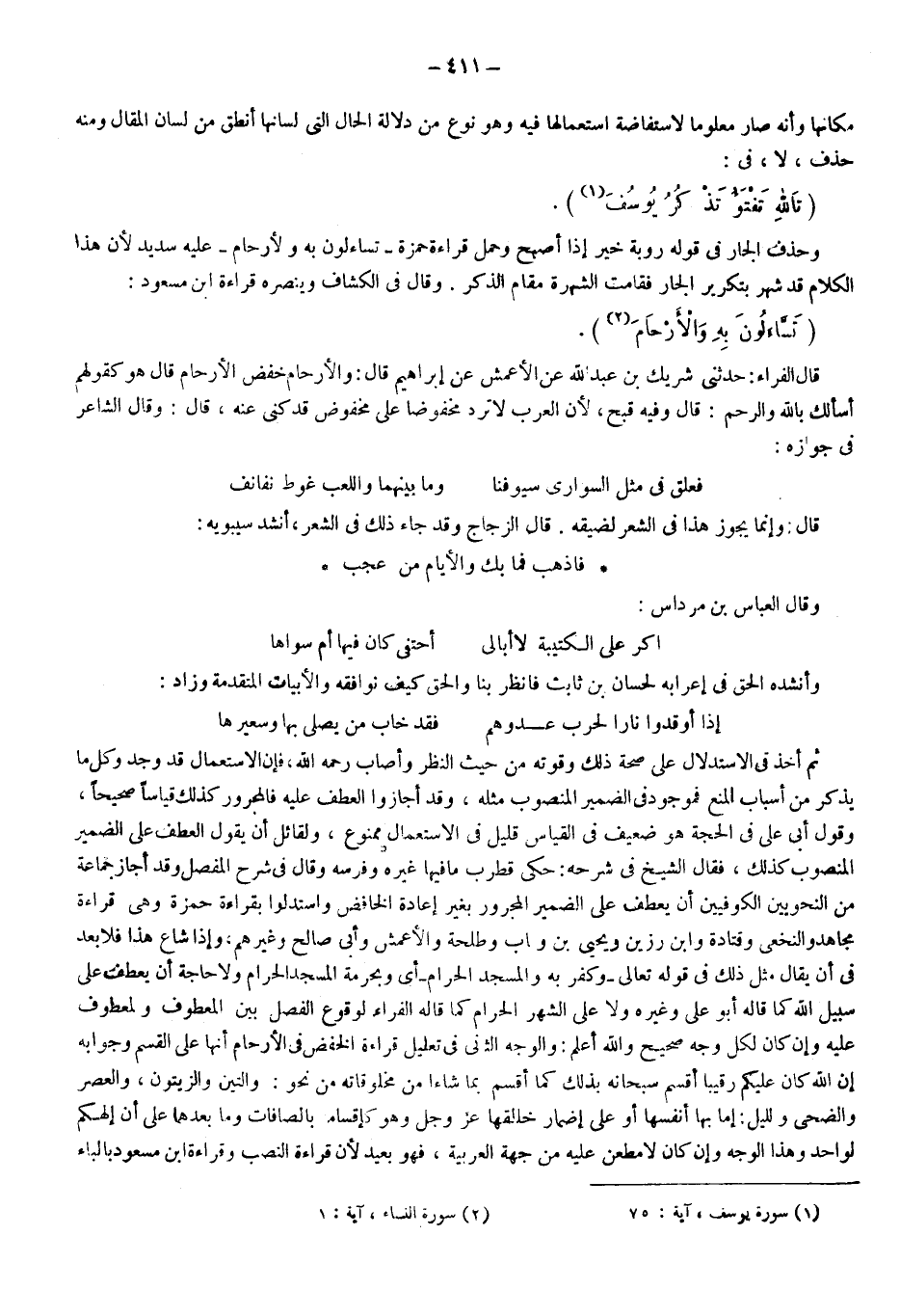 وحذف الجار في قوله: روبة خير إذا أصبح، وحمل قراءة حمزة: "تَسَاءَلُونَ بِهِ وَالْأَرْحَامِ" عليه سديد؛ لأن هذا الكلام قد شهر بتكرير الجار، فقامت الشهرة مقام الذكر، وقال في الكشاف: وينصره قراءة ابن مسعود: "تَسَاءَلُونَ بِهِ وَالْأَرْحَامَ"2.