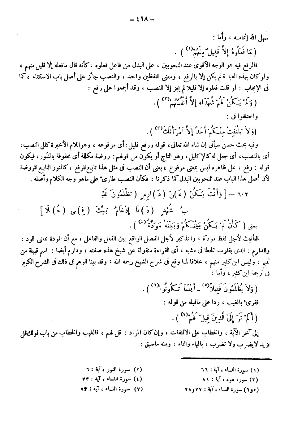 سهل الله إتمامه، وأما: {مَا فَعَلُوهُ إِلَّا قَلِيلٌ مِنْهُمْ} 1؛ فالرفع فيه هو الوجه الأقوى عند النحويين على البدل من فاعل فعلوه كأنه قال: ما فعله إلا قليل منهم ولو كان بهذه العبارة لم يكن إلا بالرفع، ومعنى اللفظين واحد، والنصب جائز على أصل باب الاستثناء كما في الإيجاب لو قلت: فعلوه إلا قليلا لم يجز إلا النصب، وقد أجمعوا على رفع: {وَلَمْ يَكُنْ لَهُمْ شُهَدَاءُ إِلَّا أَنْفُسُهُمْ} 2.