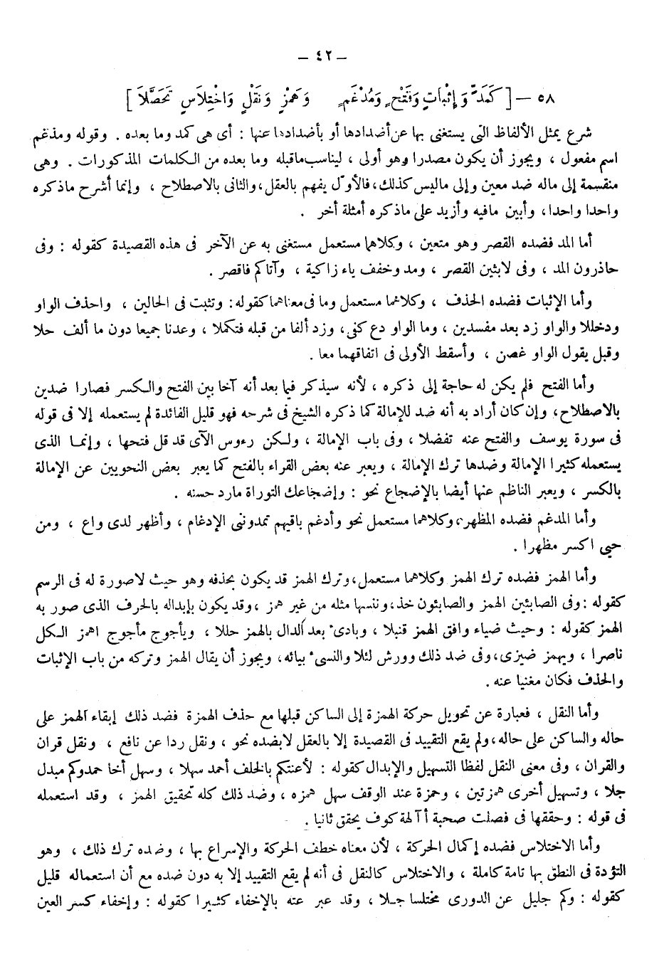 أما المد فضده القصر وهو متعين وكلاهما مستعمل مستغنى به عن الآخر في هذه القصيدة كقوله وفي حاذرون المد وفي لابثين القصر ومد وخفف ياء زاكية وآتاكم فاقصر.