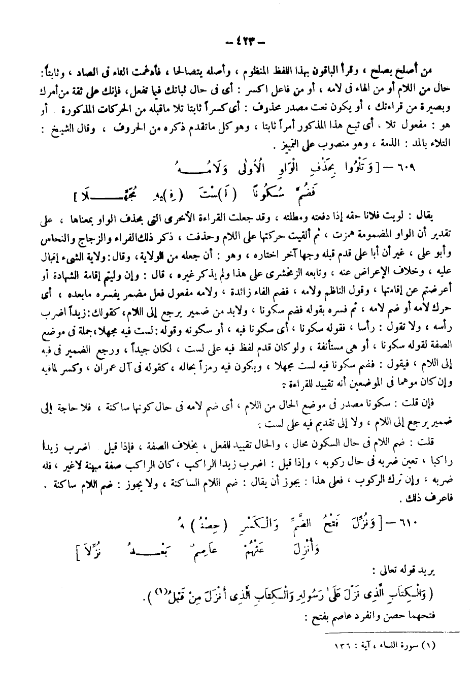 من أصلح يصلح، وقرأ الباقون بهذا اللفظ المنظوم، وأصله يتصالحا، فأدغمت التاء في الصاد وثابتا حال من اللام أو من الهاء في لامه أو من فاعل اكسر؛ أي: في حال ثباتك فيما تفعل؛ فإنك على ثقة من أمرك وبصيرة من قراءتك أو يكون نعت مصدر محذوف؛ أي: كسرا ثابتا تلا ما قبله من الحركات المذكورة أو هو مفعول تلا؛ أي: تبع هذا المذكور أمرا ثابتا وهو كل ما تقدم ذكره من الحروف، وقال الشيخ: التلاء بالمد الذمة وهو منصوب على التمييز.