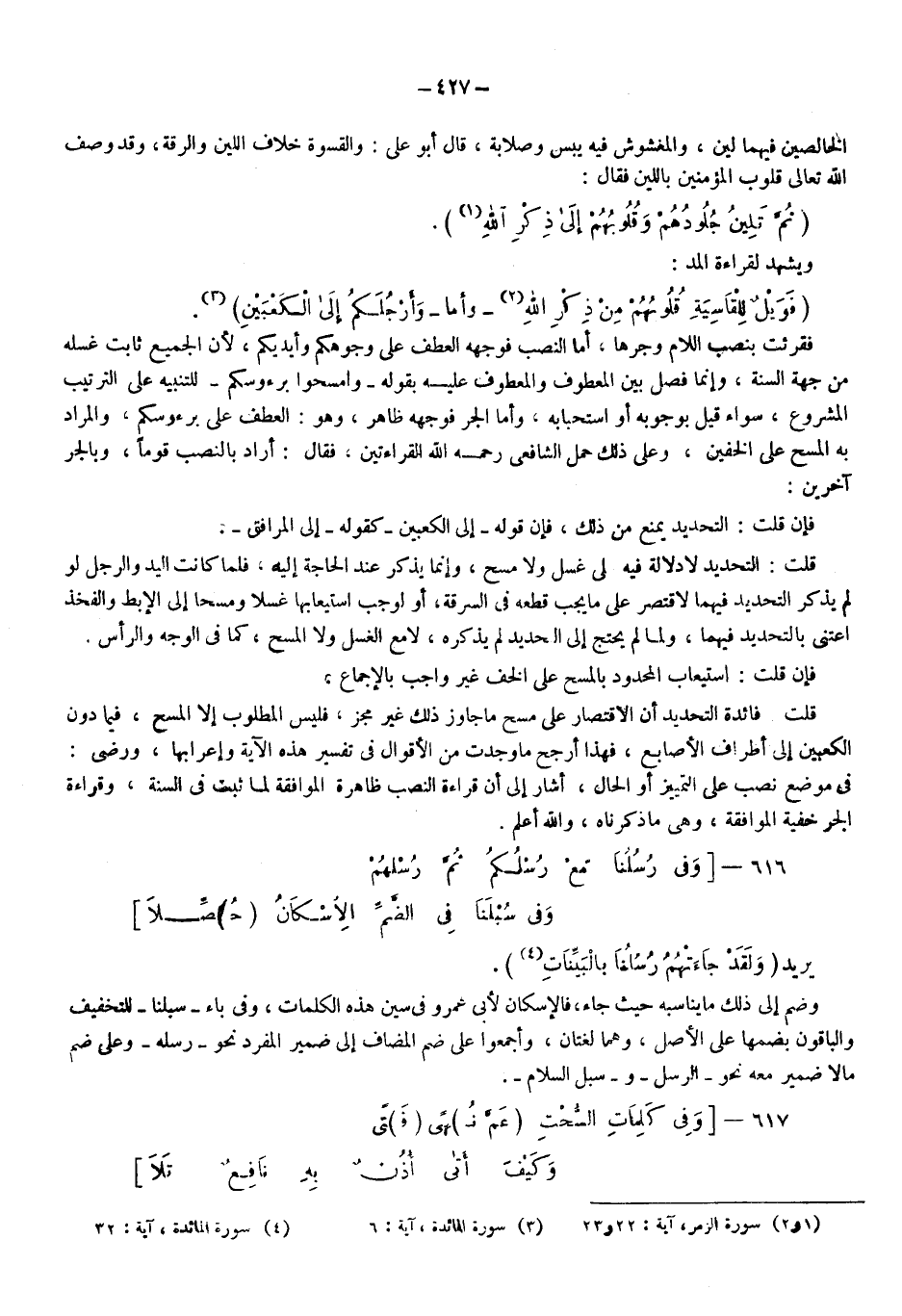 ويشهد لقراءة المد: {فَوَيْلٌ لِلْقَاسِيَةِ قُلُوبُهُمْ مِنْ ذِكْرِ اللَّهِ} 2، وأما: {وَأَرْجُلَكُمْ إِلَى الْكَعْبَيْنِ} 3، فقرئت بنصب اللام وجرها؛ أما النصب فوجهه العطف على وجوهكم وأيديكم؛ لأن الجميع ثابت غسله من جهة السنة، وإنما فصل بين المعطوف والمعطوف عليه بقوله: {وَامْسَحُوا بِرُءُوسِكُمْ} للتنبيه على الترتيب المشروع سواء قيل بوجوبه أو استحبابه، وأما الجر فوجهه ظاهر وهو: العطف على برءوسكم، والمراد به المسح على الخفين، وعلى ذلك حمل الشافعي -رحمه الله- القراءتين فقال: أراد بالنصب قوما وبالجر آخرين: