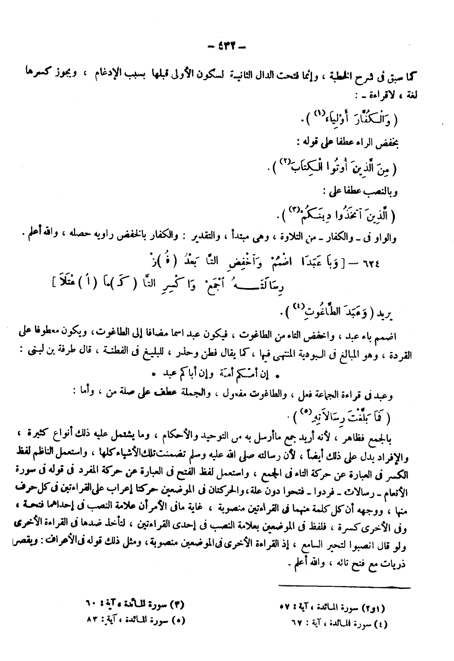 يريد: {وَعَبَدَ الطَّاغُوتَ} 4، اضمم باء عبد، واخفض التاء من الطاغوت فيكون عبدا اسما مضافا إلى الطاغوت ويكون معطوفا على القردة، وهو المبالغ في العبودية المنتهي فيها كما يقال فطن وحذر للبليغ في الفطنة، قال طرفة: