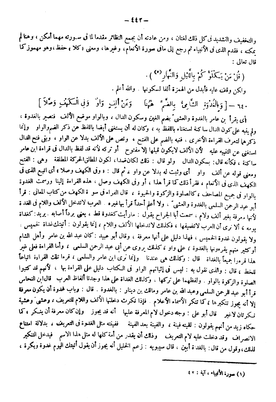 والتخفيف والتشديد في كل ذلك لغتان ومن عادته أن يجمع النظائر مقدما لما في سورته مهما أمكن، وهنا لم يمكنه فقدم الذي في الأنبياء، ثم رجع إلى ما في سورة الأنعام وغيرها ومعنى كلا حفظ وهو مهموز كما قال تعالى: "قُلْ مَنْ يَكْلَؤُكُمْ بِاللَّيْلِ وَالنَّهَارِ"1، ولكن وقف عليه، فأبدل من الهمزة ألفا؛ لسكونها والله أعلم.