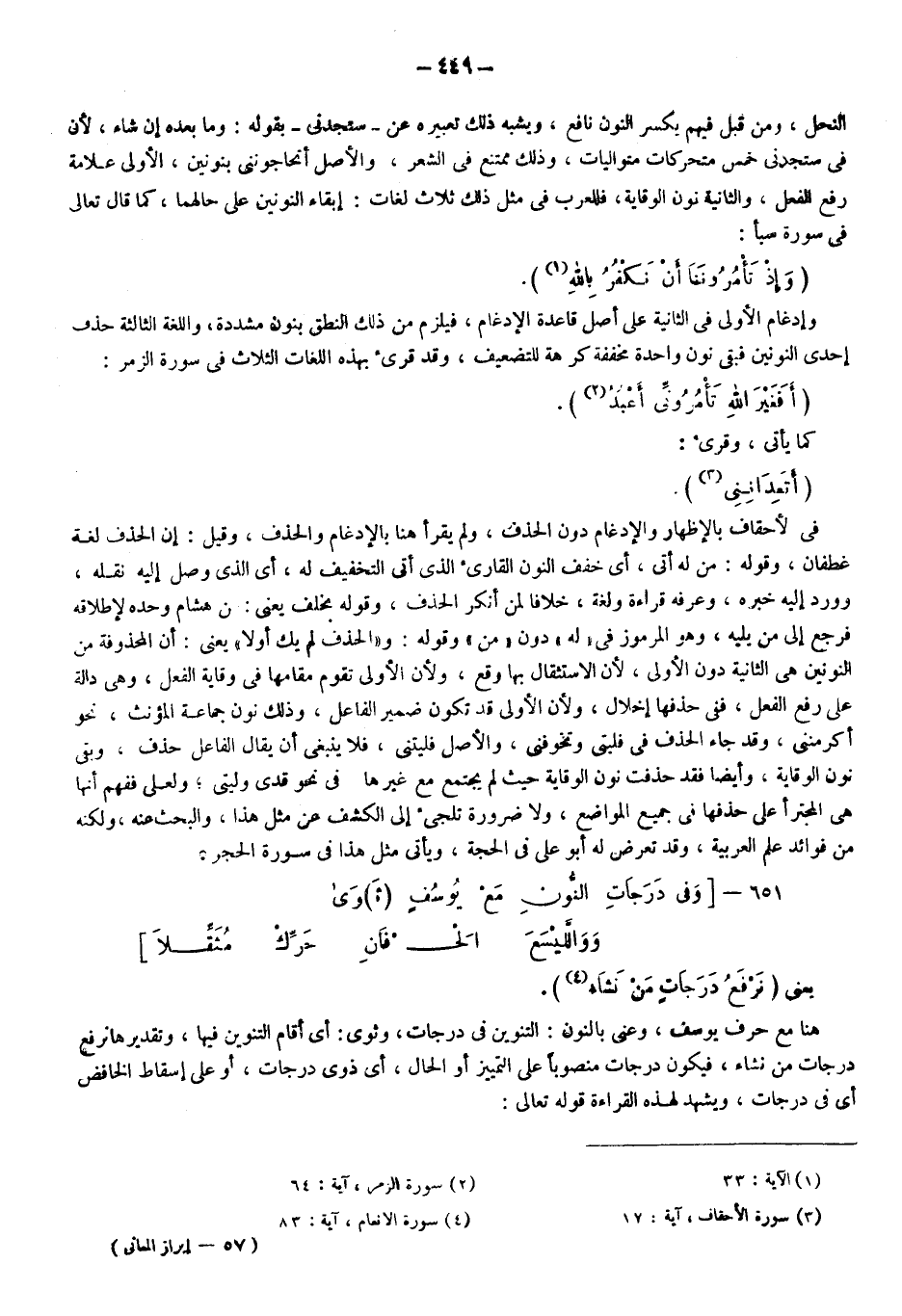 النحل، ومن قبل فيهم يكسر النون نافع، ويشبه ذلك تعبيره عن "ستجدني" بقوله: وما بعده إن شاء؛ لأن في ستجدني خمس متحركات متواليات وذلك ممتنع في الشعر، والأصل: أتحاجونني بنونين الأولى علامة رفع الفعل، والثانية نون الوقاية فللعرب في مثل ذلك ثلاث لغات؛ إبقاء النونين على حالهما كما قال تعالى في سورة سبأ: {إِذْ تَأْمُرُونَنَا أَنْ نَكْفُرَ بِاللَّهِ} 1، وإدغام الأولى في الثانية على أصل قاعدة الإدغام فيلزم من ذلك النطق بنون مشددة واللغة الثالثة حذف إحدى النونين فبقي نون واحدة مخففة كرهة للتضعيف وقد قرئ بهذه اللغات الثلاث في سورة الزمر: {أَفَغَيْرَ اللَّهِ تَأْمُرُونِّي أَعْبُدُ} 2.