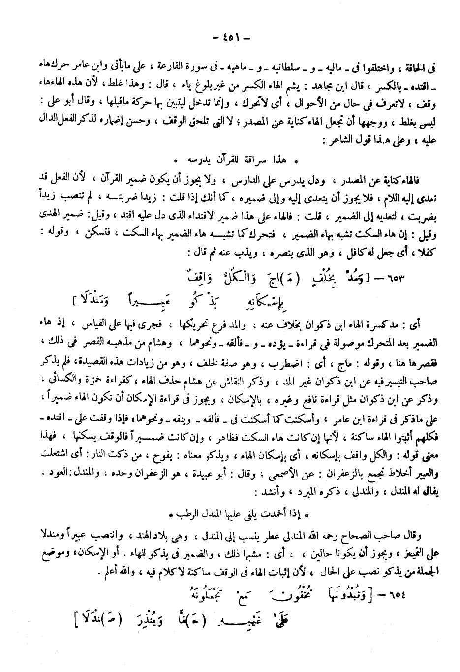 أي: مد كسرة الهاء ابن ذكوان بخلاف عنه، والمد فرع تحريكها، فجرى فيها على القياس؛ إذ هاء الضمير بعد المتحرك موصولة في قراءة "يؤده" و"فألفه"، ونحوهما، وهشام من مذهبه القصر في ذلك فقصرها هنا، وقوله: ماج؛ أي: اضطرب وهو صفة لخلف، وهو من زيادات هذه القصيدة فلم يذكر صاحب التيسير فيه عن ابن ذكوان غير المد، وذكر النقاش عن هشام حذف الهاء كقراءة حمزة والكسائي، وذكر عن ابن ذكوان مثل قراءة نافع وغيره بالإسكان، ويجوز في قراءة الإسكان أن تكون الهاء ضميرًا على ما ذكر في قراءة ابن عامر، وأسكنت كما أسكنت في "فألقه" "ويتقه" ونحوهما، فإذا وقفت على "اقتده" فكلهم أثبتوا الهاء ساكنة؛ لأنها إن كانت هاء السكت فظاهر، وإن كانت ضميرا فالوقف يسكنها فهذا معنى قوله: والكل واقف بإسكانه؛ أي: بإسكان الهاء ويذكو معناه: يفوح من ذكت النار؛ أي: اشتعلت، والعبير أخلاط تجمع بالزعفران، عن الأصمعي وقال أبو عبيدة: هو الزعفران وحده والمندل: العود يقال له المندل والمندلي، ذكره المبرد، وأنشد: