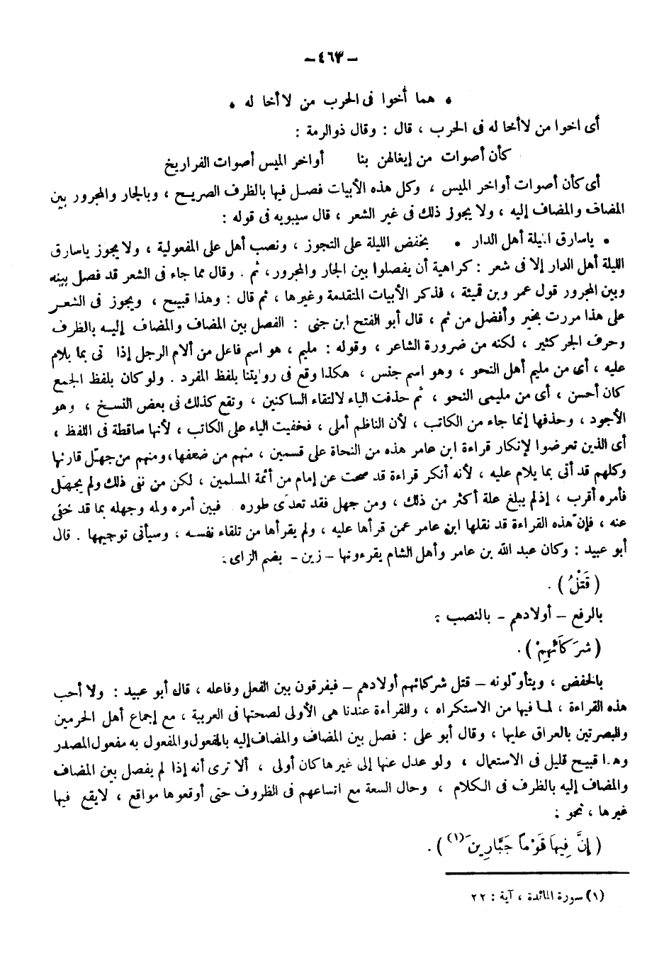 بخفض الليلة على التجوز ونصب أهل على المفعولية ولا يجوز يا سارق الليلة أهل الدار إلا في شعر؛ كراهية أن يفصلوا بين الجار والمجرور ثم وقال مما جاء في الشعر قد فصل بينه وبين المجرور قول عمرو بن قميئة فذكر الأبيات المتقدمة وغيرها ثم قال وهذا قبيح ويجوز في الشعر على هذا مررت بخير وأفضل من ثم قال أبو الفتح ابن جني: الفصل بين المضاف والمضاف إليه بالظرف، وحرف الجر كثير، لكنه من ضرورة الشاعر، وقوله: مليم هو اسم فاعل من ألام الرجل إذا أتى بما يلام عليه؛ أي: من مليم أهل النحو وهو اسم جنس هكذا وقع في روايتنا بلفظ المفرد، ولو كان بلفظ الجمع كان أحسن؛ أي: من مليمي النحو ثم حذفت الياء لالتقاء الساكنين وتقع كذلك في بعض النسخ وهو الأجود وحذفها إنما جاء من الكاتب؛ لأن الناظم أملى، فخفيت الياء على الكاتب؛ لأنها ساقطة في اللفظ؛ أي: الذين تعرضوا لإنكار قراءة ابن عامر هذه من النحاة على قسمين؛ منهم من ضعفها ومنهم من جهل قارئها، وكلهم قد أتى بما يلام عليه؛ لأنه أنكر قراءة قد صحت عن إمام من أئمة المسلمين، لكن من نفى ذلك ولم يجه فأمره أقرب؛ إذ لم يبلغ علة أكثر من ذلك، ومن جهل فقد تعدى طوره فبين أمره ولمه وجهله بما قد خفي عنه؛ فإن هذه القراءة قد نقلها ابن عامر عمن قرأها عليه، ولم يقرأها من تلقاء نفسه، وسيأتي توجيهها، قال أبو عبيد: وكان عبد الله بن عامر وأهل الشام يقرءونها "زين" بضم الزاي، "قُتِلَ"، بالرفع، "أولادهم" بالنصب، "شُرَكَائِهِمْ" بالخفض ويتأولونه "قتل شركائهم أولادهم"، فيفرقون بين الفعل وفاعله، قال أبو عبيد: ولا أحب هذه القراءة؛ لما فيها من الاستكراه، والقراءة عندنا هي الأولى؛ لصحتها في العربية مع إجماع أهل الحرمين والبصرتين بالعراق عليها، وقال أبو علي: فصل بين المضاف والمضاف إليه بالمفعول والمفعول به مفعول المصدر، وهذا قبيح قليل في الاستعمال، ولو عدل عنها إلى غيرها كان أولى؛ ألا ترى أنه إذا لم يفصل بين المضاف والمضاف إليه بالظرف في الكلام وحال السعة مع اتساعهم في الظروف حتى أوقعوها مواقع لا يقع فيها غيرها نحو: {إِنَّ فِيهَا قَوْمًا جَبَّارِينَ} 1.