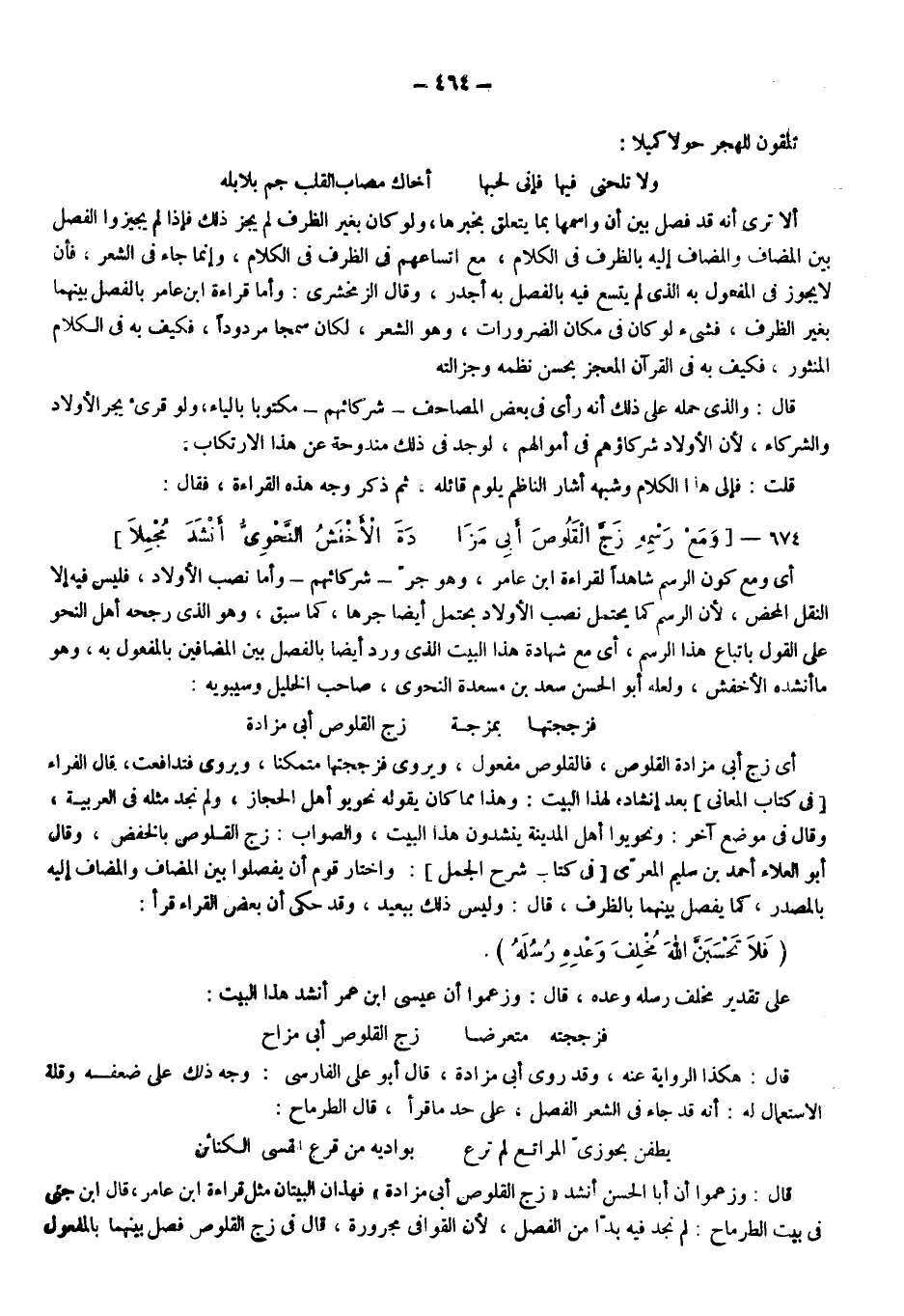 قال: وزعموا أن أبا الحسن أنشد: "زج القلوص أبي مزادة"، فهذان البيتان مثل قراءة ابن عامر، قال ابن جني في بيت الطرماح: لم نجد فيه بدا من الفصل؛ لأن القوافي مجرورة، قال: في زج القلوص فصل بينهما بالمفعول
