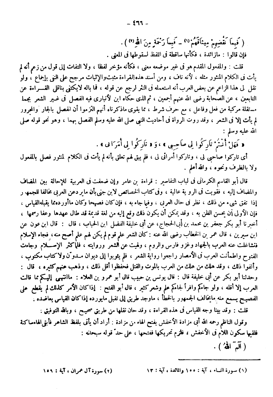 قال أبو القاسم الكرماني في لباب التفاسير: قراءة ابن عامر وإن ضعفت في العربية؛ للإحالة بين المضاف والمضاف إليه فقويت في الرواية عالية، وفي كتاب الخصائص لابن جني بأن ما يرد عن العربي مخالفا للجمهور إذا اتفق شيء من ذلك نظر في حال العربي، وفيما جاء به فإن كان فصيحا، وكان ما أورده مما يقبله القياس فإن الأولى أن يحسن الظن به، وقد يمكن أن يكون ذلك وقع إليه من لغة قديمة قد طال عهدها وعفا رسمها، أخبرنا أبو بكر جعفر بن محمد بن أبي الحجاج عن أبي خليفة الفضل ابن الحباب قال: قال ابن عون عن ابن سيرين: قال عمر بن الخطا رضي الله عنه: كان الشعر علم قوم لم يكن لهم علم أصح منه، فجاء الإسلام، فتشاغلت عنه العرب بالجهاد وغزو فارس والروم، ولهيت عن الشعر وروايته، فلما كثر الإسلام وجاءت الفتوح واطمأنت العرب في الأمصار راجعوا رواية الشعر، فلم يئوبوا إلى ديوان مدون ولا كتاب مكتوب، وألفوا ذلك وقد هلك من هلك من العرب بالموت والقتل، فحفظوا أقل ذلك وذهب عنهم كثيره. قال: وحدثنا أبو بكر عن أبي خليفة قال: قال يونس بن حبيب: قال أبو عمرو بن العلاء: ما انتهى إليكم مما قالت العرب إلا أقله، ولو جاءكم وافرٌ؛ لجاءكم علم وشعر كثير. قال أبو الفتح: إذا كان الأمر كذلك لم يقطع على الفصيح يسمع منه ما يخالف الجمهور بالخطأ ما وجد طريق إلى تقبل ما يورده إذا كان القياس يعاضده.