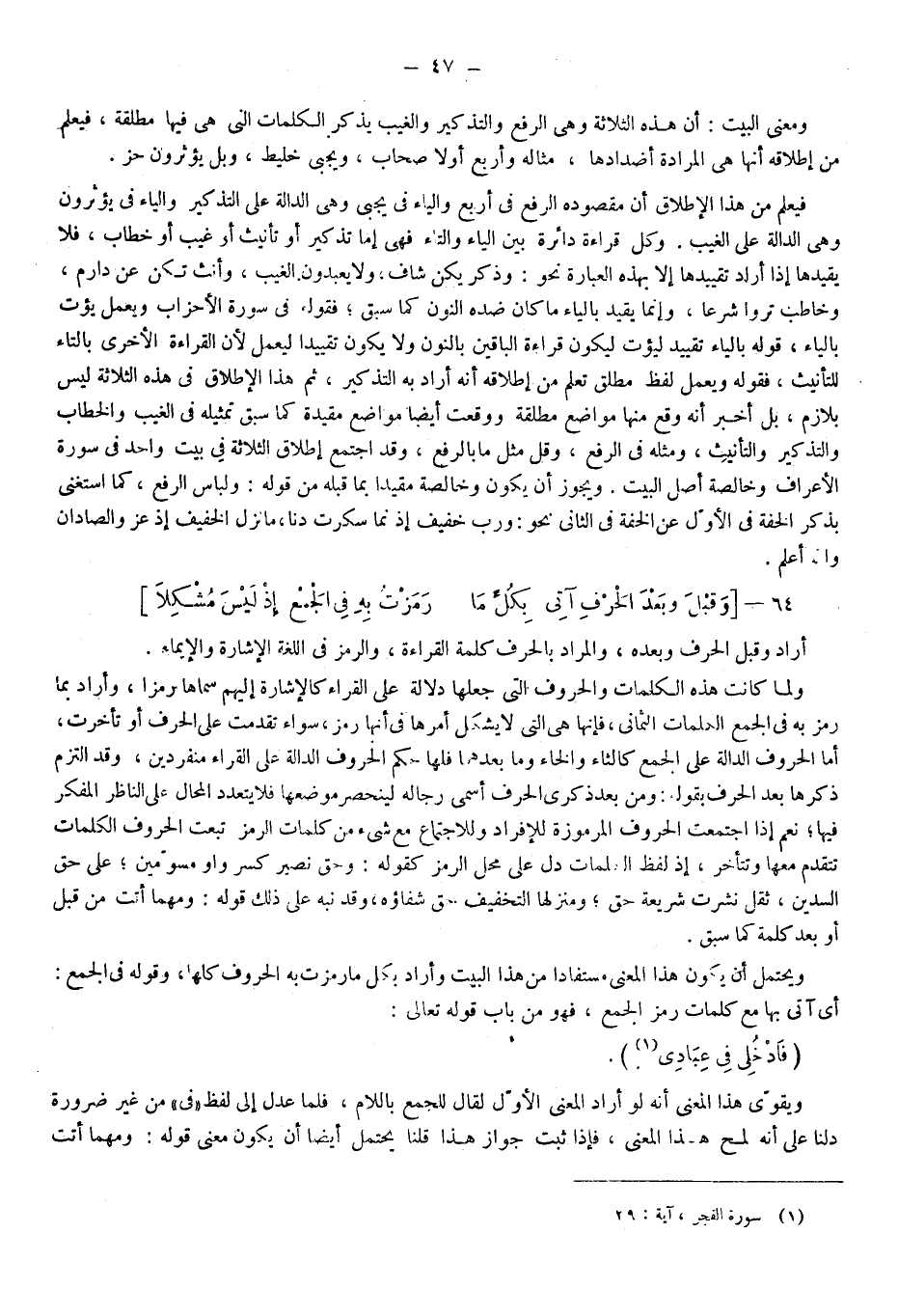 ويحتمل أن يكون هذا المعنى مستفادًا من هذا البيت وأراد بكل ما رمزت به الحروف كلها وقوله: "في الجمع" أي آتى بها مع كلمات رمز الجمع فهو من باب قوله تعالى: {فَادْخُلِي فِي عِبَادِي} 1.