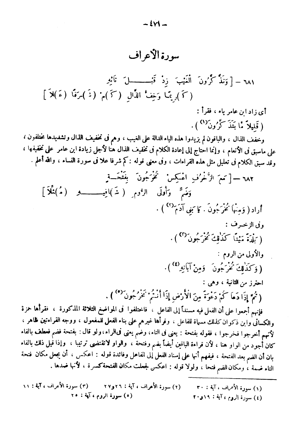أراد {وَمِنْهَا تُخْرَجُونَ، يَا بَنِي آدَمَ} 2، وفي الزخرف: {بَلْدَةً مَيْتًا كَذَلِكَ تُخْرَجُونَ} 3، والأولى من الروم: {وَكَذَلِكَ تُخْرَجُونَ، وَمِنْ آيَاتِهِ} 4، احترز من الثانية وهي: {ثُمَّ إِذَا دَعَاكُمْ دَعْوَةً مِنَ الْأَرْضِ إِذَا أَنْتُمْ تَخْرُجُونَ} 5؛ فإنهم أجمعوا على أن الفعل فيه مسندا إلى الفاعل، فاختلفوا في المواضع الثلاثة المذكورة، فقرأها حمزة والكسائي وابن ذكوان كذلك مسماة للفاعل، وقرأها غيرهم على بناء الفعل للمفعول، ووجه القراءتين ظاهر؛ لأنهم أخرجوا فخرجوا فقوله: بفتحة: يعني: في التاء وضم يعني: في الراء ولو قال: بفتحة فضم فعطف بالفاء كان أجود من الواو هنا؛ لأن قراءة الباقين أيضا بضم وفتحة والواو لا تقتضي ترتيبا وإذا قيل ذلك بالفاء بان أن الضم بعد الفتحة، فيفهم أنها على إسناد الفعل إلى الفاعل، وفائدة قوله: اعكس أن يجعل مكان فتحة التاء ضمة ومكان الضم فتحا، ولولا قوله: اعكس لجعلت مكان الفتحة كسرة؛ لأنها ضدها.