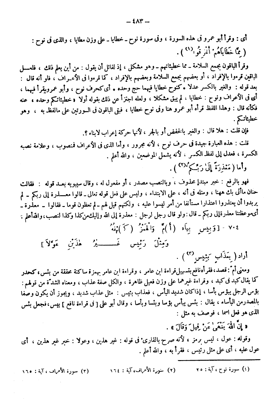 أي: وقرأ أبو عمرو في هذه السورة وفي سورة نوح "خطايا" على وزن مطايا، والذي في نوح: "مما خطاياهم أغرقوا"1، وقرأ الباقون بجمع السلامة: {مِمَّا خَطِيئَاتِهِمْ} وهو مشكل؛ إذ لقائل أن يقول: من أين يعلم ذلك؟ فلعل الباقين قرءوا بالإفراد أو بعضهم بجمع السلامة وبعضهم بالإفراد كما قرءوا في الأعراف، فلو أنه قال بعد قوله: والغير بالكسر عدلا كنوح خطايا فيهما حج وحده؛ أي: كحرف نوح، وأبو عمرو قرأ فيهما -أي: في الأعراف ونوح- خطايا لم يبق مشكلا، ولعله اجتزأ عن ذلك بقوله أولا: خطيئاتكم وحده عنه، فكأنه قال: وهذا اللفظ قرأه أبو عمرو هنا وفي نوح خطايا، فبقي الباقون في السورتين على ما لفظ به وهو خطيئاتكم.