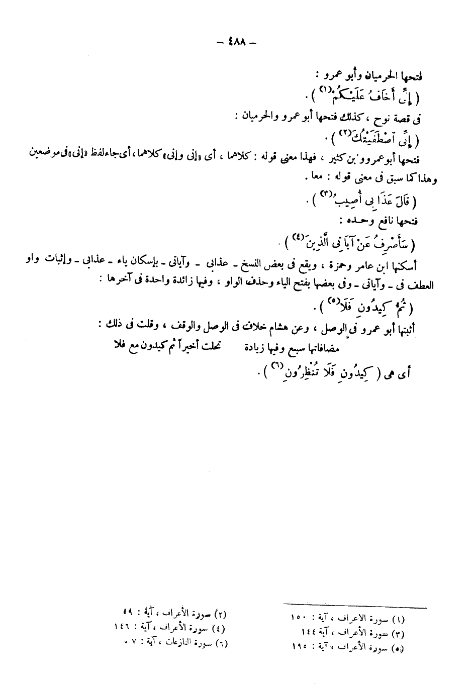 "سَأَصْرِفُ عَنْ آيَاتِي الَّذِينَ"4، أسكنها ابن عامر وحمزة، ويقع في بعض النسخ "عذابي" وآياتي بإسكان ياء "عذابي"، وإثبات واو العطف في "وآياتي"، وفي بعضها بفتح الياء وحذف الواو وفيها زائدة واحدة في آخرها.