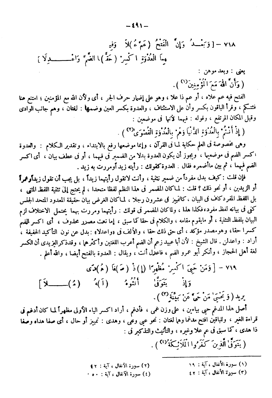 الفتح فيه عم علاه أو عم ذا علا، وهو على إضمار حرف الجر؛ أي: ولأن الله مع المؤمنين امتنع عنا فئتكم، وقرأ الباقون بكسر وأن على الاستئناف والعدوة بكسر العين وضمها: لغتان وهي جانب الوادي وقيل المكان المرتفع، وقوله: فيهما؛ لأنها في موضعين: {إِذْ أَنْتُمْ بِالْعُدْوَةِ الدُّنْيَا وَهُمْ بِالْعُدْوَةِ الْقُصْوَى} 2، وهي مخصوصة في العلم حكاية لما في القرآن، وإنما موضعها رفع بالابتداء وتقدير الكلام: والعدوة اكسر الضم في موضعيها، ويجوز أن يكون العدوة بدلا من الضمير في فيهما أو في عطف بيان؛ أي: اكسر الضم فيهما ثم بيَّن ما أضمره فقال العدوة كقولك: رأيته زيدًا ومررت به زيد.