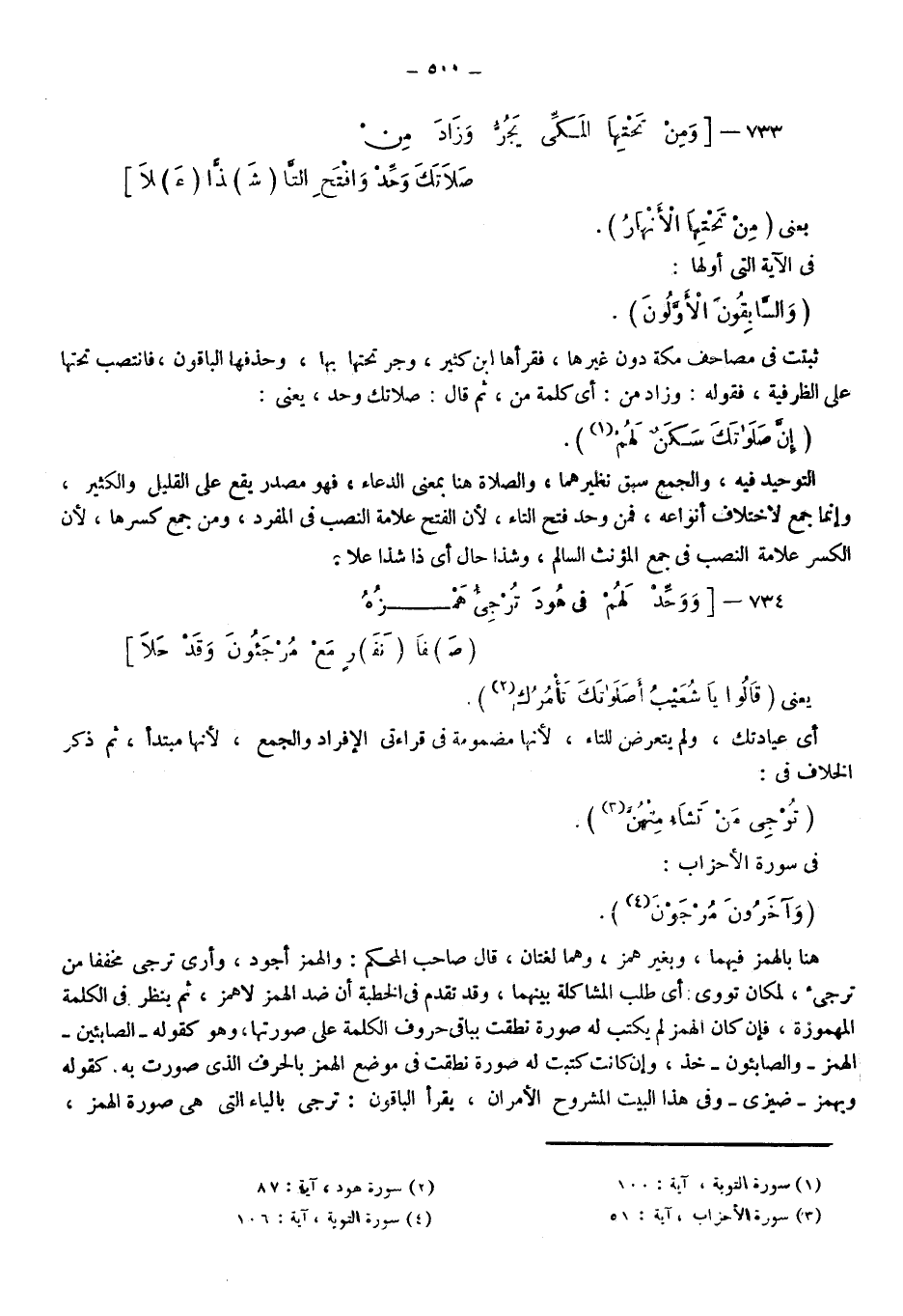 يعني: {قَالُوا يَا شُعَيْبُ أَصَلَاتُكَ تَأْمُرُكَ} 2؛ أي عيادتك ولم يتعرض للتاء؛ لأنها مضمومة في قراءتي الإفراد والجمع؛ لأنها مبتدأ ثم ذكر الخلاف في: {تُرْجِي مَنْ تَشَاءُ مِنْهُنَّ} 3، في سورة الأحزاب: {وَآخَرُونَ مُرْجَوْنَ} 4، هنا بالهمز فيهما وبغير همز، وهما لغتان، قال صاحب المحكم: والهمز أجود، وأرى ترجي مخففا من ترجيء لمكان تؤوى؛ أي: طلب المشاكلة بينهما، وقد تقدم في الخطبة أن ضد الهمز لا همز، ثم ينظر في الكلمة المهموزة فإن كان الهمز لم يكتب له صورة نطقت بباقي حروف الكلمة على صورتها، وهو كقوله: "الصابئين" الهمز "والصابئون" خذ، وإن كانت كتبت له صورة نطقت في موضع الهمز بالحرف الذي صورت به كقوله: وبهمز "ضيزى"، وفي هذا البيت المشروح الأمران يقرأ الباقون: ترجي بالياء التي هي صورة الهمز،
