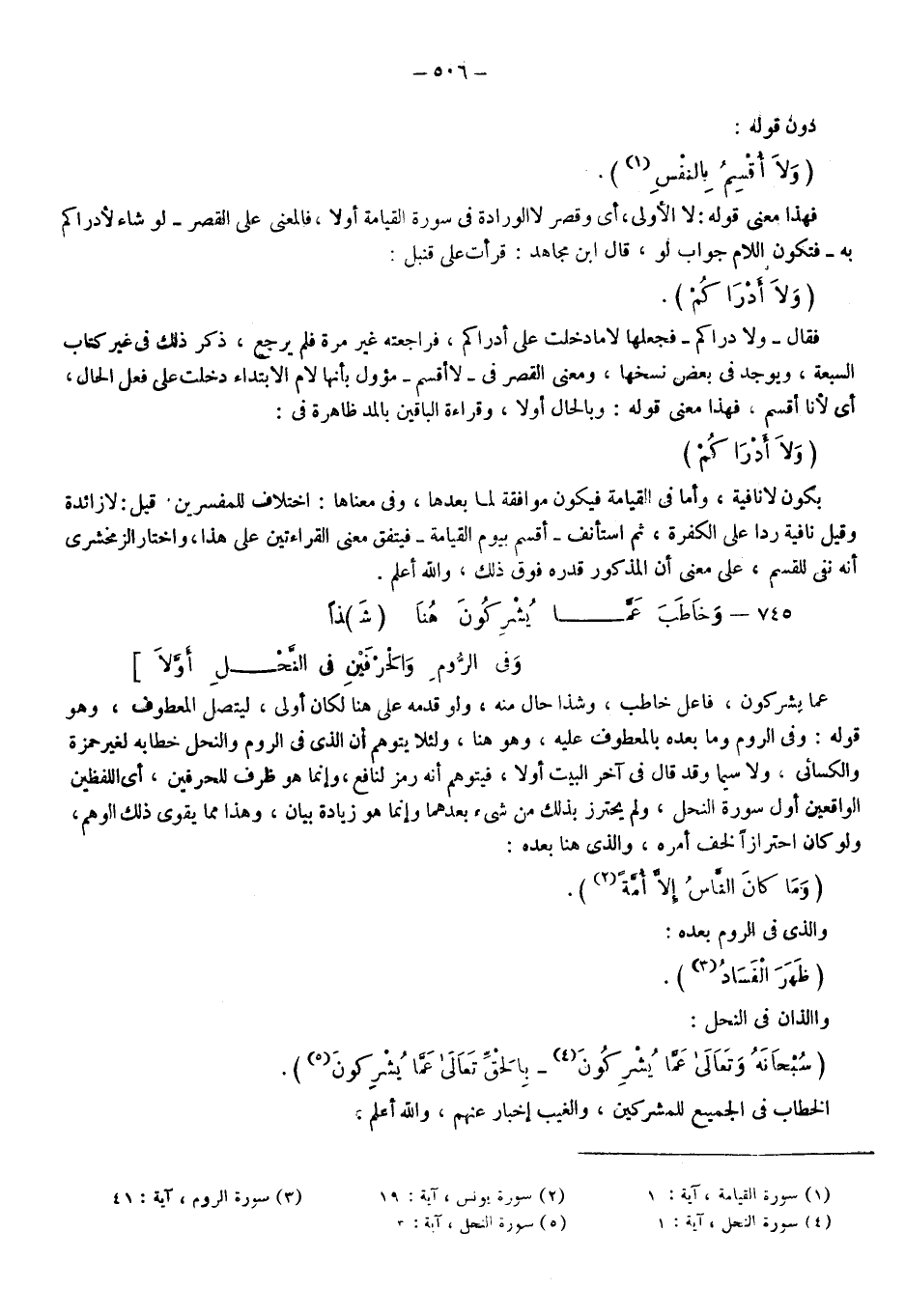 دون قوله: {وَلا أُقْسِمُ بِالنَّفْسِ} 1، فهذا معنى قوله: لا الأولى؛ أي: وقصر لا الواردة في سورة القيامة أولا فالمعنى على القصر: "وشاء لأدراكم به" فتكون اللام جواب لو قال ابن مجاهد: قرأت على قنبل: {وَلا أَدْرَاكُمْ} ، فقال: "ولا دراكم"، فجعلها "لا" ما دخلت على أدراكم، فراجعته غير مرة فلم يرجع ذكر ذلك في غير كتاب السبعة، ويوجد في بعض نسخها، ومعنى القصر في "لا أقسم" مؤول بأنها لام الابتداء دخلت على فعل الحال أي؛ لأنا أقسم فهذا معنى قوله: وبالحال أولا، وقراءة الباقين بالمد ظاهرة في: {وَلا أَدْرَاكُمْ} ، بكون لا نافية، أما في القيامة فيكون موافقة لما بعدها، وفي معناها اختلاف للمفسرين قبل لا زائدة، وقيل: نافية ردا على الكفرة ثم استأنف: "أقسم بيوم القيامة" فيتفق معنى القراءتين على هذا، واختار الزمخشري أنه نفي للقسم على معنى أن المذكور قدره فوق ذلك والله أعلم.
