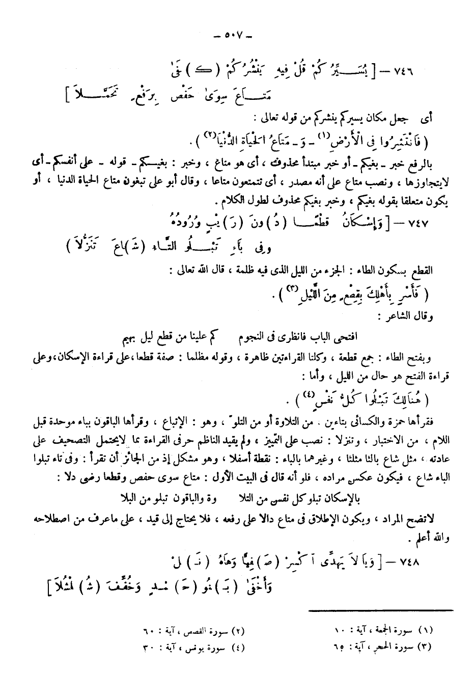 وبفتح الطاء: جمع قطعة، وكلتا القراءتين ظاهرة، وقوله: مظلما صفة قطعا على قراءة الإسكان، وعلى قراءة الفتح هو حال من الليل؛ وأما: {هُنَالِكَ تَبْلُو كُلُّ نَفْسٍ} 4، فقرأها حمزة والكسائي بتاءين من التلاوة أو من التلو وهو: الإتباع، وقرأها الباقون بباء موحدة قبل اللام من الاختبار، وتنزلا: نصب على التمييز، ولم يقيد الناظم حرفي القراءة بما لا يحتمل التصحيف على عادته مثل شاع بالثا مثلثا، وغيرهما بالباء نقطة أسفلا، وهو مشكل؛ إذ من الجائز أن تقرأ: وفي تاء تبلوا الباء شاع، فيكون عكس مراده، فلو أنه قال في البيت الأول: متاع سوى حفص وقطعا رضى دلا: