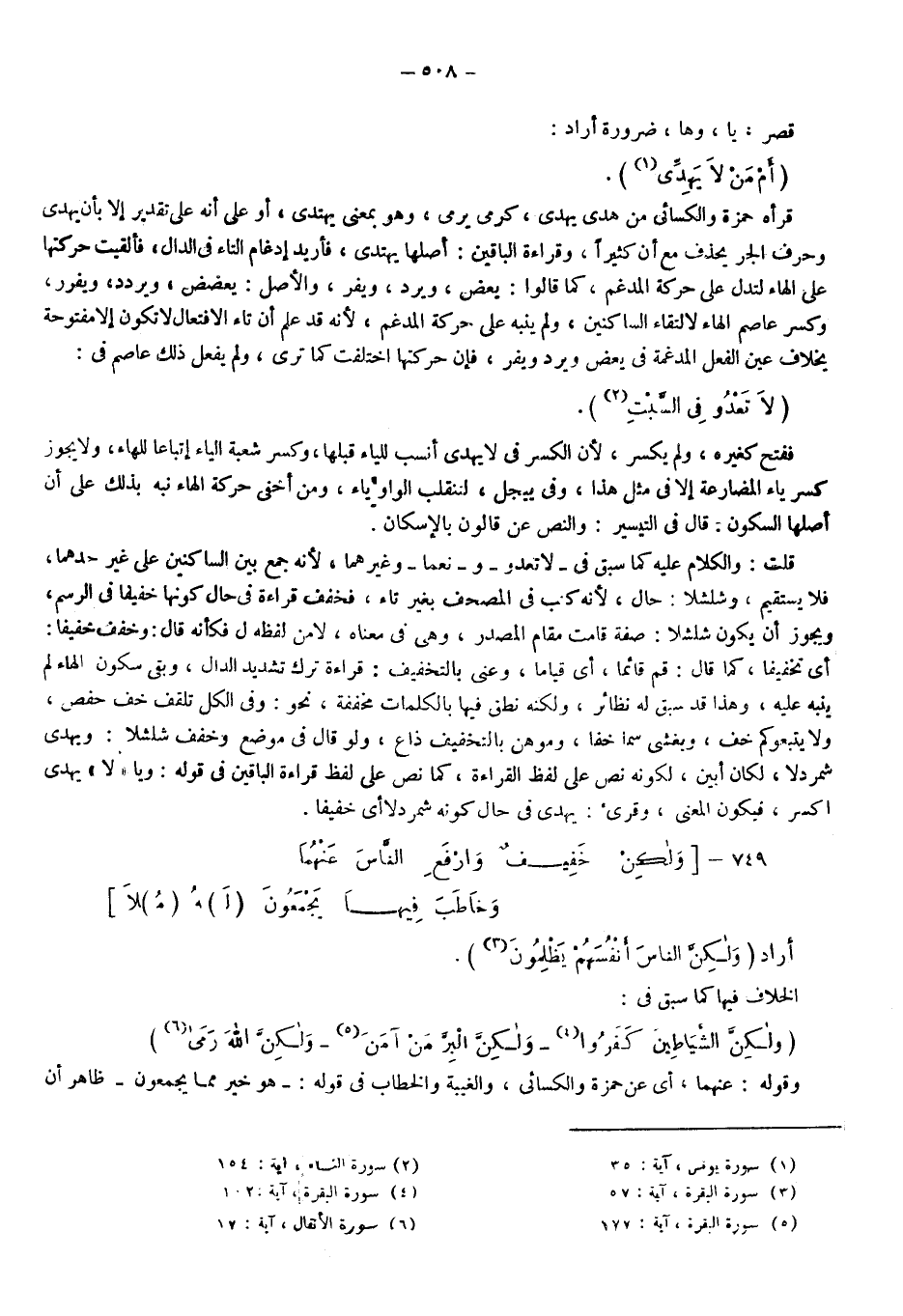 قصر يا وها ضرورة أراد: {أَمَّنْ لَا يَهِدِّي} 1، قرأه حمزة والكسائي من "هدَى" "يهدِي" كـ "رمى يرمي"، وهو بمعنى يهتدى، أو على أنه على تقدير إلا بأن يُهدَى وحرف الجر يحذف مع "أن" كثيرا وقراءة الباقين أصلها يهتدى، فأريد إدغام التاء في الدال فألقيت حركتها على الهاء؛ لتدل على حركة المدغم كما قالوا: يعض ويرد ويفر والأصل يعضض ويردد ويفرر، وكسر عاصم الهاء؛ لالتقاء الساكنين، ولم ينبه على حركة المدغم؛ لأنه قد علم أن تاء الافتعال لا تكون إلا مفتوحة بخلاف عين الفعل المدغمة في يعضّ ويردّ ويفرّ؛ فإن حركتها اختلفت كما ترى، ولم يفعل ذلك عاصم في: {لا تَعْدُوا فِي السَّبْتِ} 2، ففتح كغيره ولم يكسر؛ لأن الكسر في "لا يهِدّي" أنسب للياء قبلها، وكسر شعبة الياء إتباعا للهاء ولا يجوز كسر ياء المضارعة إلا في مثل هذا، وفي "ييجل"؛ لتنقلب الواو ياء، ومن أخفى حركة الهاء نبه بذلك على أن أصلها السكون، قال في التيسير: والنص عن قالون بالإسكان.