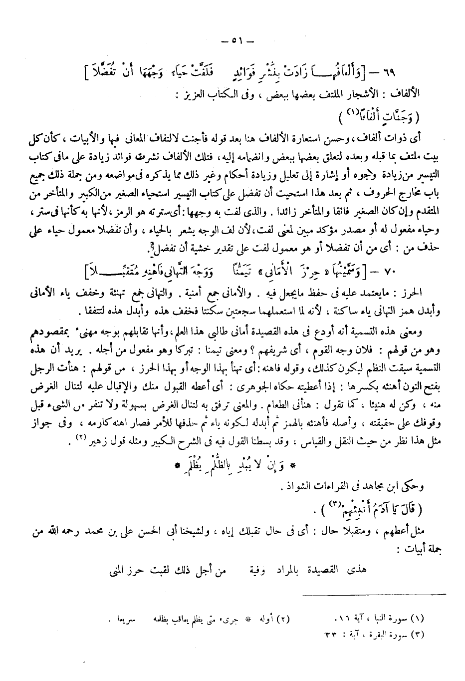 أي ذوات ألفاف وحسن استعارة الألفاف هنا بعد قوله فأجنت؛ لالتفاف المعاني فيها والأبيات كأن كل بيت ملتف بما قبله وبعده لتعلق بعضها ببعض وانضمامه إليه فتلك الألفاف نشرت فوائد زيادة على ما في كتاب التيسير من زيادة وجوه أو إشارة إلى تعليل وزيادة أحكام وغير ذلك مما يذكره في مواضعه، ومن جملة ذلك جميع باب مخارج الحروف، ثم بعد هذا استحيت أن تفضل على كتاب التيسير استحياء الصغير من الكبير والمتأخر من المتقدم وإن كان الصغير فائقا والمتأخر زائدا، والذي لفَّت به وجهها أي سترته هو الرمز؛ لأنها به كأنها في ستر وحياء مفعول له أو مصدر مؤكد مبين لمعنى لفت؛ لأن لف الوجه يشعر بالحياء وأن تفضلا معمول حياء على حذف من أي من أن تفضلا أو هو معمول لفت على تقدير خشية أن تفضل.