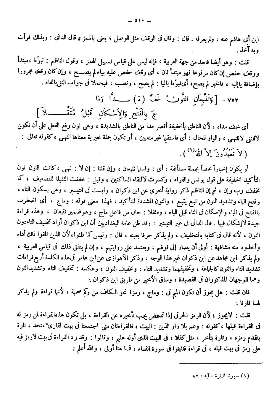 قلت: وهو أيضا فاسد من جهة العربية فإنه ليس على قياس تسهيل الهمز، وقول الناظم: تبوءا مبتدأ ووقف حفص إن كان مرفوعا، فهو مبتدأ ثانٍ؛ أي: وقف حفص عليه بياء لم يصح وإن كان وقف مجرورًا بإضافة "يا" إليه فالخبر لم يصح؛ أي: تبوءا باليا لم يصح ونصب فيحملا في جواب النفي بالفاء.