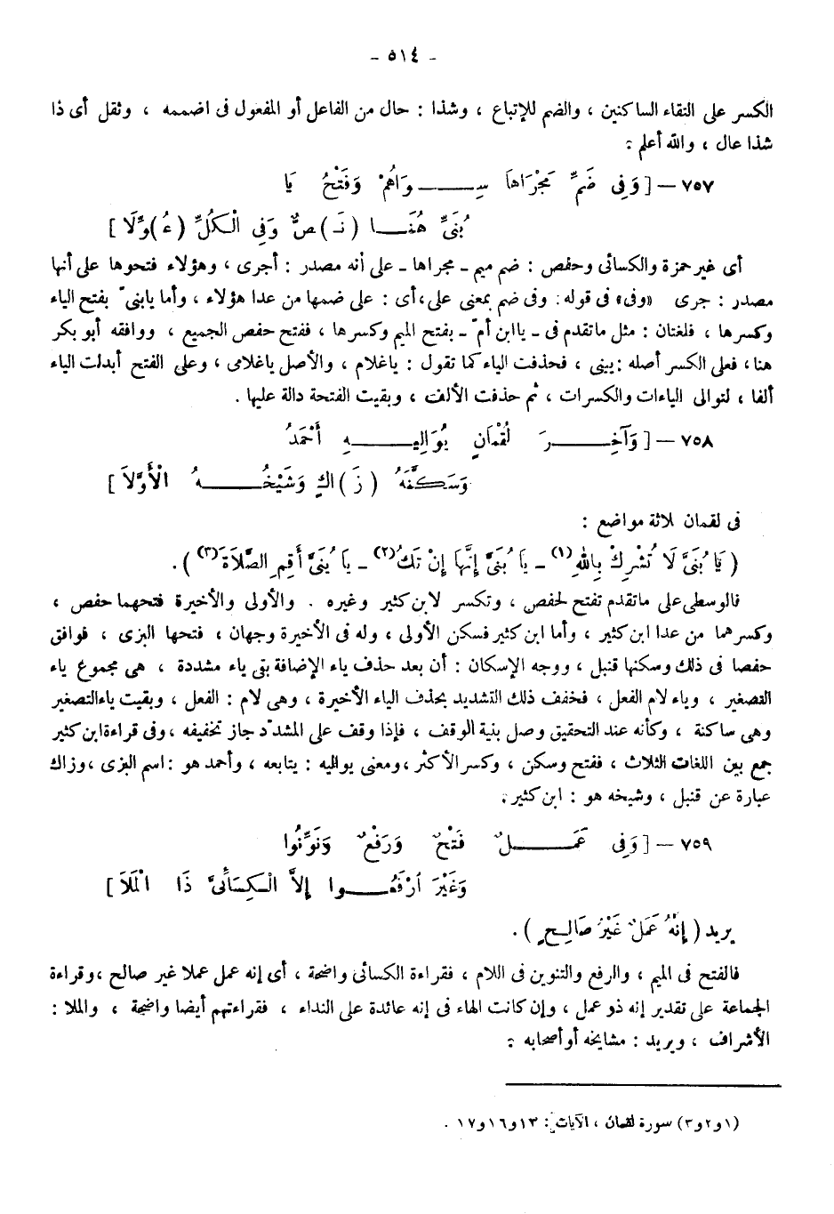 في لقمان ثلاثة مواضع: {يَا بُنَيَّ لا تُشْرِكْ بِاللَّهِ} 1، {يَا بُنَيَّ إِنَّهَا إِنْ تَكُ} 2، {يَا بُنَيَّ أَقِمِ الصَّلاةَ} 3، فالوسطى على ما تقدم تفتح لحفص وتكسر لابن كثير وغيره. والأولى والأخيرة فتحهما حفص وكسرهما من عدا ابن كثير، أما ابن كثير فسكن الأولى وله في الأخيرة وجهان؛ فتحها البزي فوافق حفصا في ذلك وسكنها قنبل، ووجه الإسكان أن بعد حذف ياء الإضافة بقي ياء مشددة هي مجموع ياء التصغير وياء لام الفعل، فخفف ذلك التشديد بحذف الياء الأخيرة، وهي لام الفعل وبقيت ياء التصغير وهي ساكنة وكأنه عند التحقيق وصل بنية الوقف فإذا وقف على المشدد جاز تخفيفه، وفي قراءة ابن كثير جمع بين اللغات الثلاث ففتح وسكن وكسر الأكثر، ومعنى يواليه يتابعه وأحمد هو اسم البزي، وزاكٍ عبارة عن قنبل وشيخه هو ابن كثير.