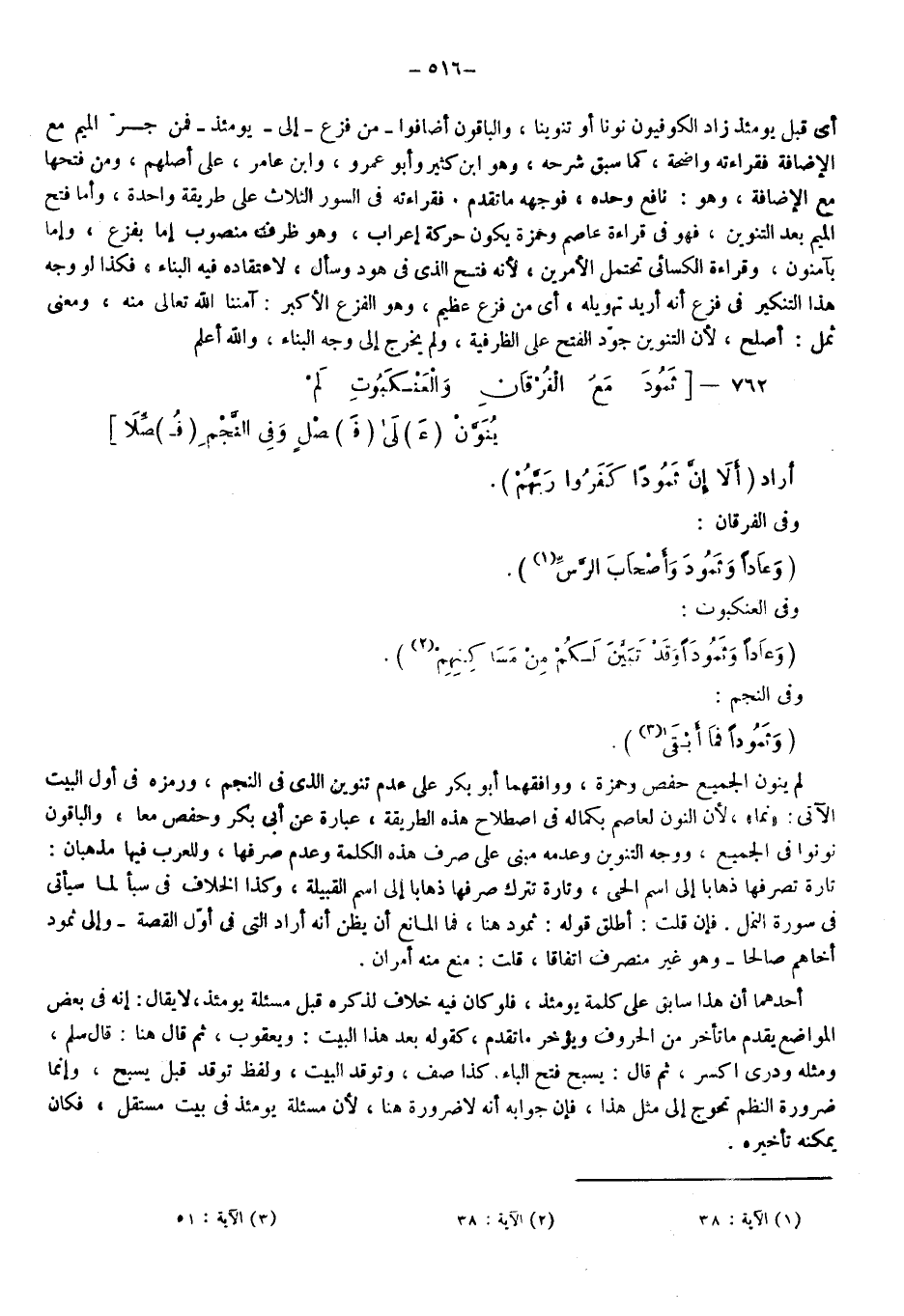 لم ينون الجميع حفص وحمزة، ووافقهما أبو بكر على عدم تنوين الذي في النجم، ورمزه في أول البيت الآتي نما؛ لأن النون لعاصم بكماله في اصطلاح هذه الطريقة عبارة عن أبي بكر وحفص معا، والباقون نونوا في الجميع، ووجه التنوين وعدمه مبني على صرف هذه الكلمة وعدم صرفها، وللعرب فيها مذهبان تارة تصرفها ذهابا إلى اسم الحي، وتارة تترك صرفها ذهابا إلى اسم القبيلة، وكذا الخلاف في سبأ لما سيأتي في سورة النمل، فإن قلت: أطلق قوله: ثمود هنا فما المانع أن يظن أنه أراد التي في أول القصة: {وَإِلَى ثَمُودَ أَخَاهُمْ صَالِحًا} وهو غير منصرف اتفاقا، قلت: منع منه أمران.