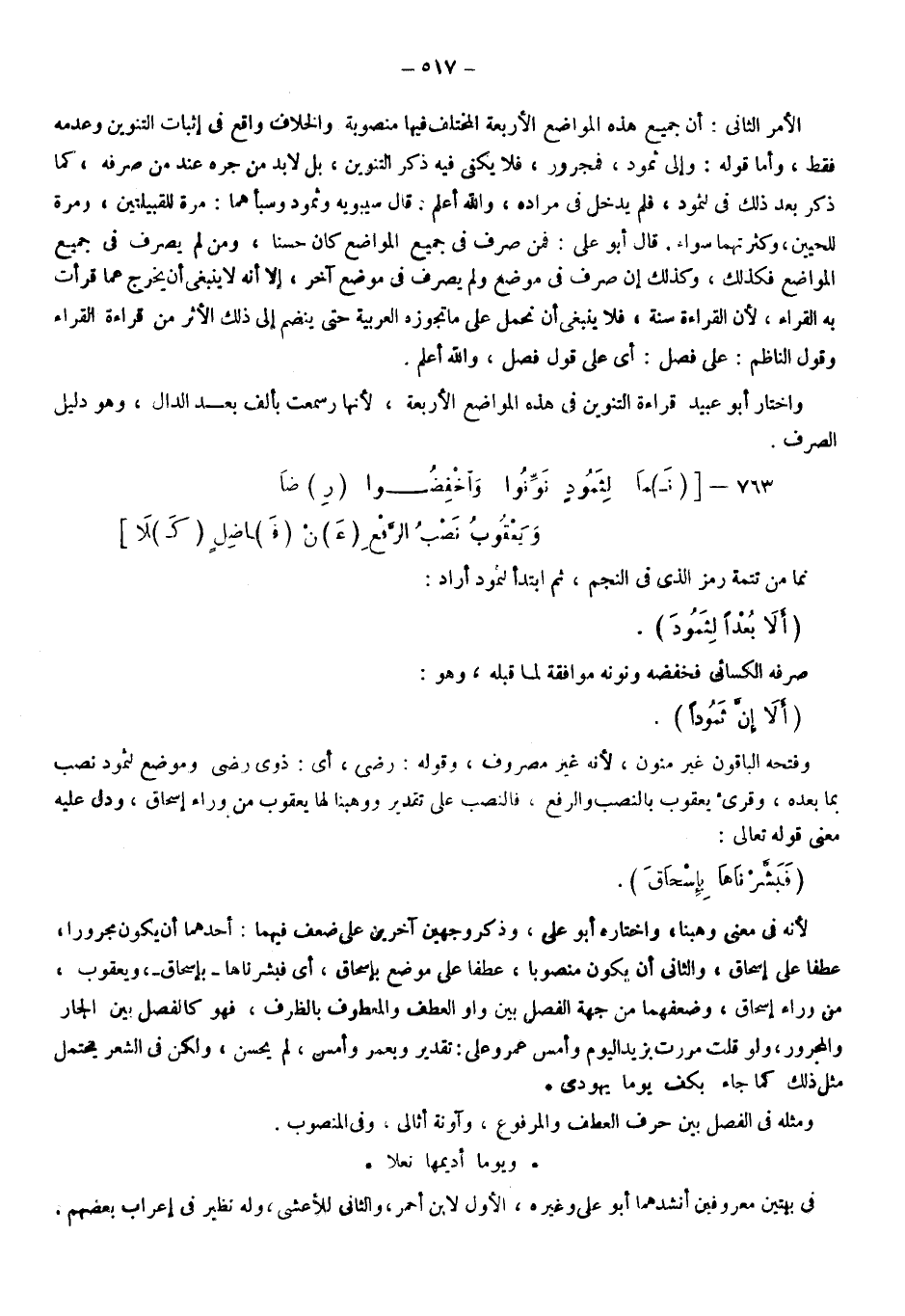 الأمر الثاني: أن جميع هذه المواضع الأربعة المختلف فيها منصوبة والخلاف واقع في إثبات التنوين وعدمه فقط، أما قوله: وإلى ثمود فمجرور فلا يكفي فيه ذكر التنوين بل لا بد من جره عند من صرفه كما ذكر بعد ذلك في "لثمود" فلم يدخل في مراده والله أعلم، قال سيبويه: وثمود وسبأ هما مرة للقبيلتين ومرة للحيين وكثرتهما سواء، قال أبو علي: فمن صرف في جميع المواضع كان حسنا، ومن لم يصرف في جميع المواضع فكذلك، وكذلك إن صرف في موضع ولم يصرف في موضع آخر إلا أنه لا ينبغي أن يخرج عما قرأت به القراء؛ لأن القراءة سنة فلا ينبغي أن نحمل على ما تجوزه العربية حتى ينضم إلى ذلك الأثر من قراءة القراء، وقول الناظم: على فصل؛ أي: على قول فصل والله أعلم.